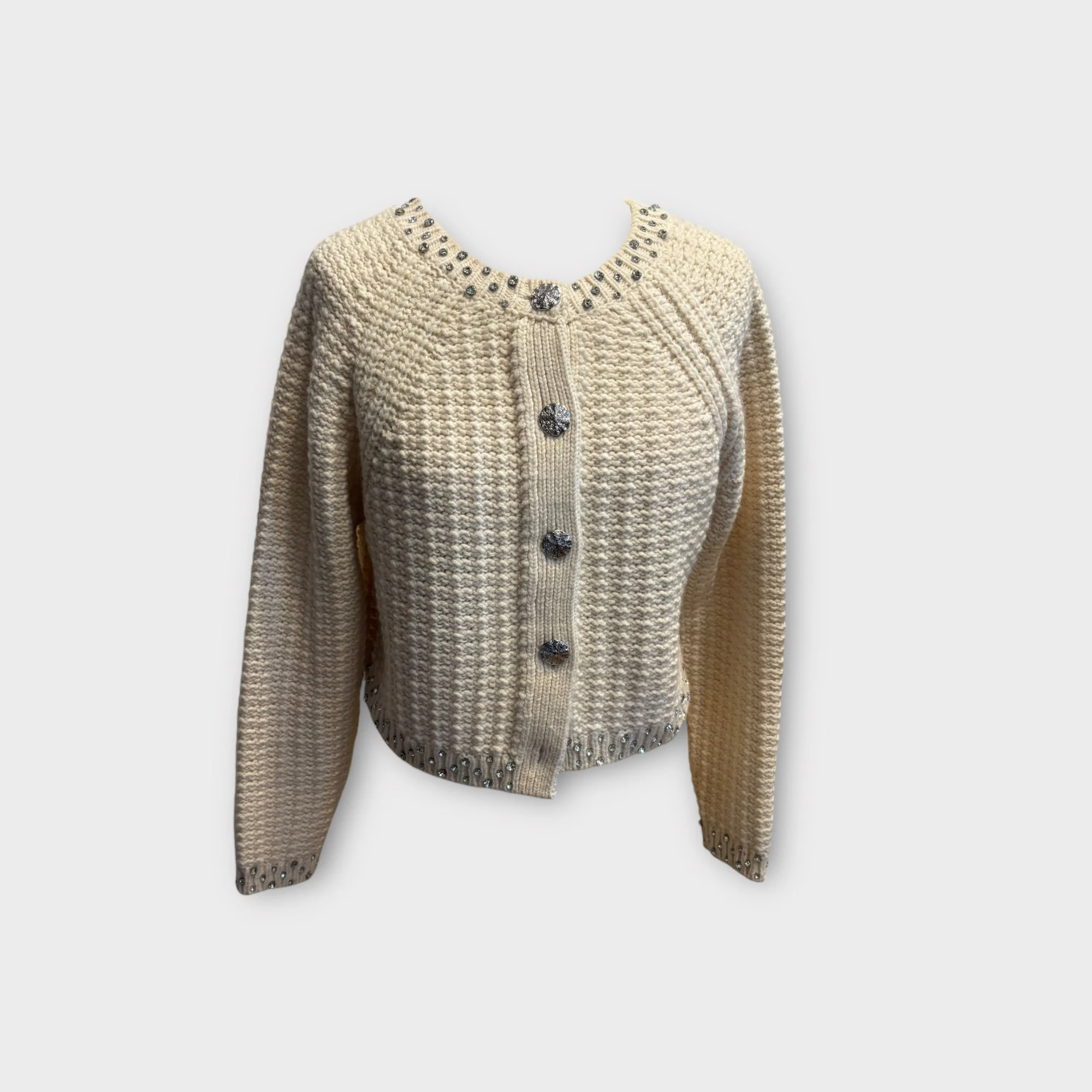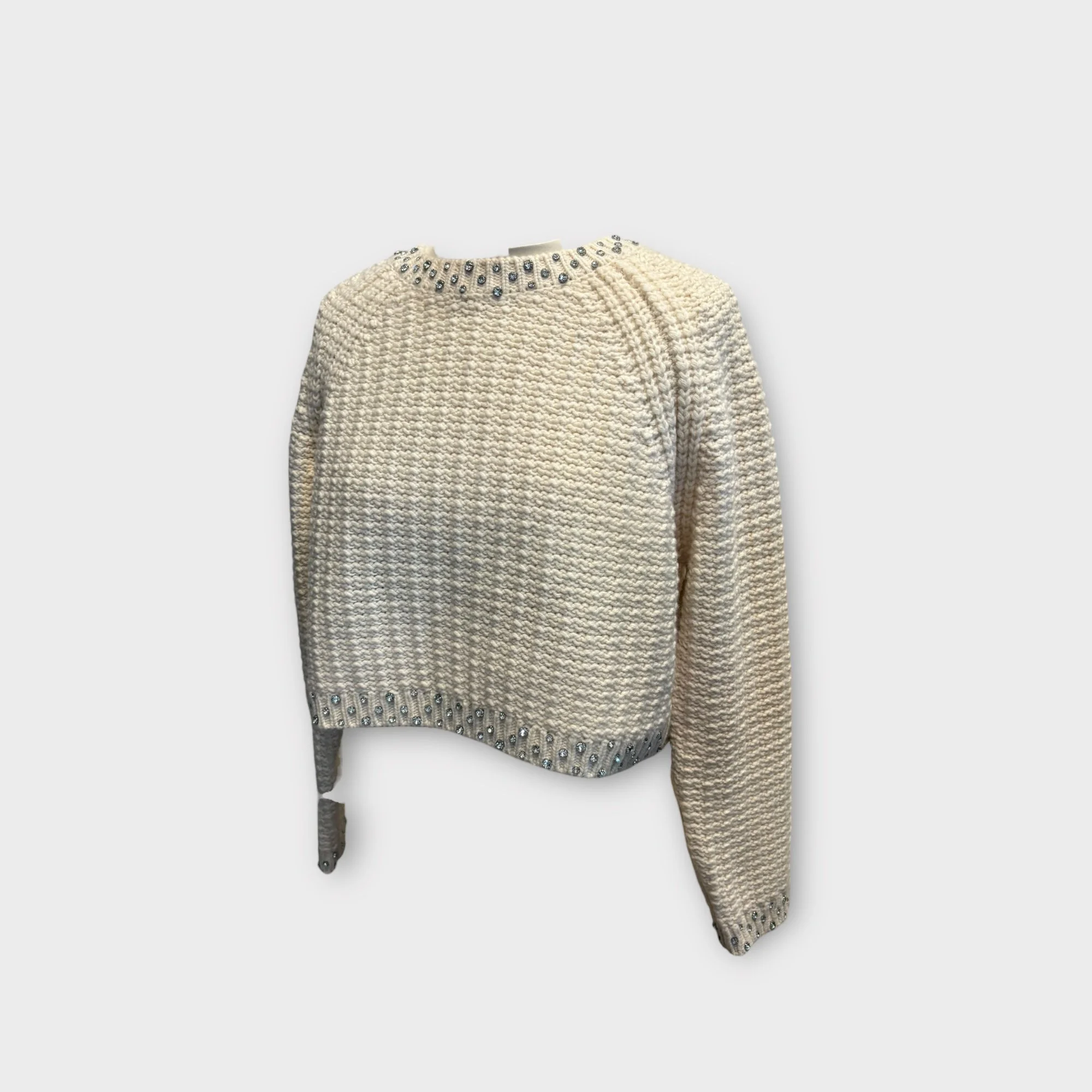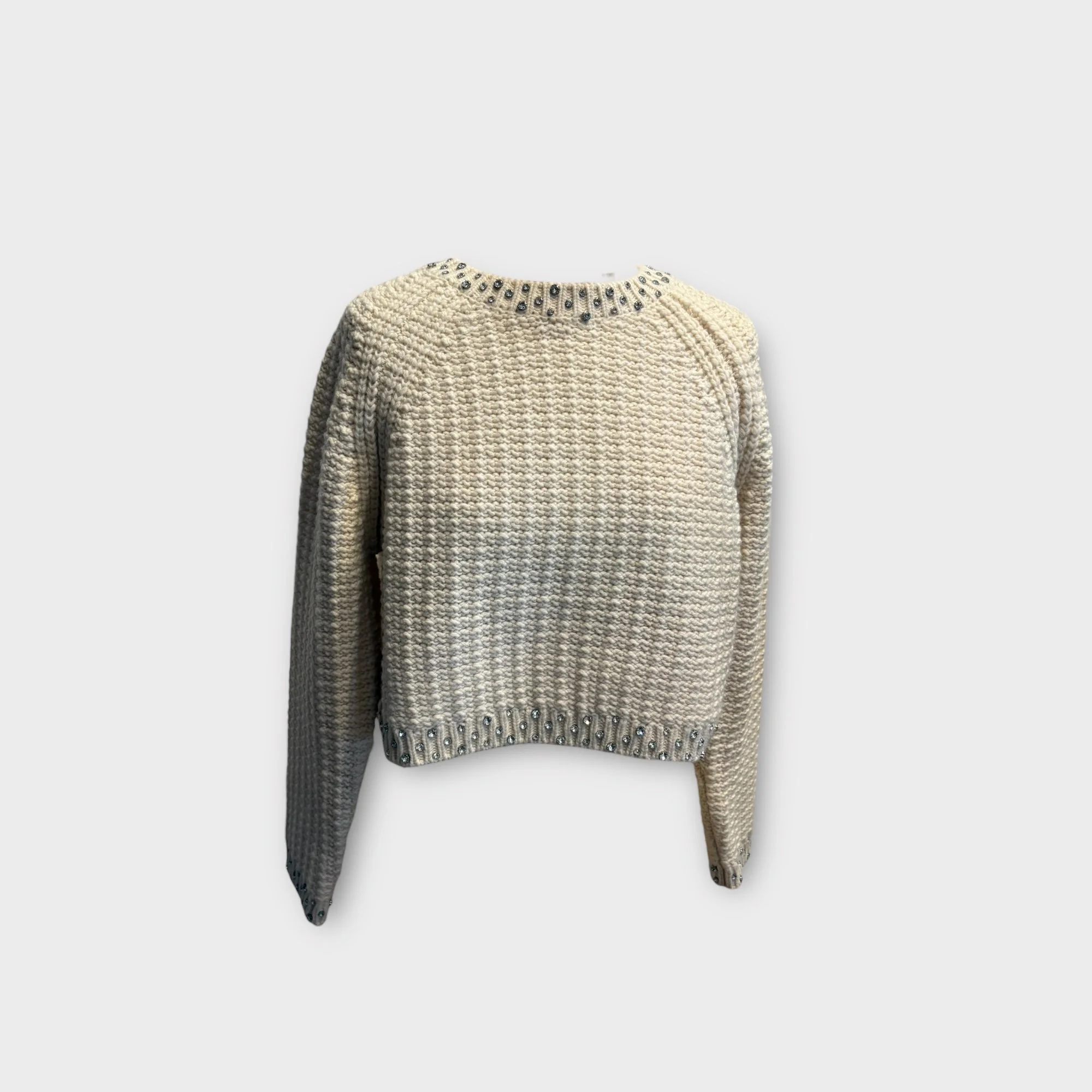 Pull ou gilet court en laine écru réhaussé de strass au niveau du col, des bas de manches et du bas du pull/gilet