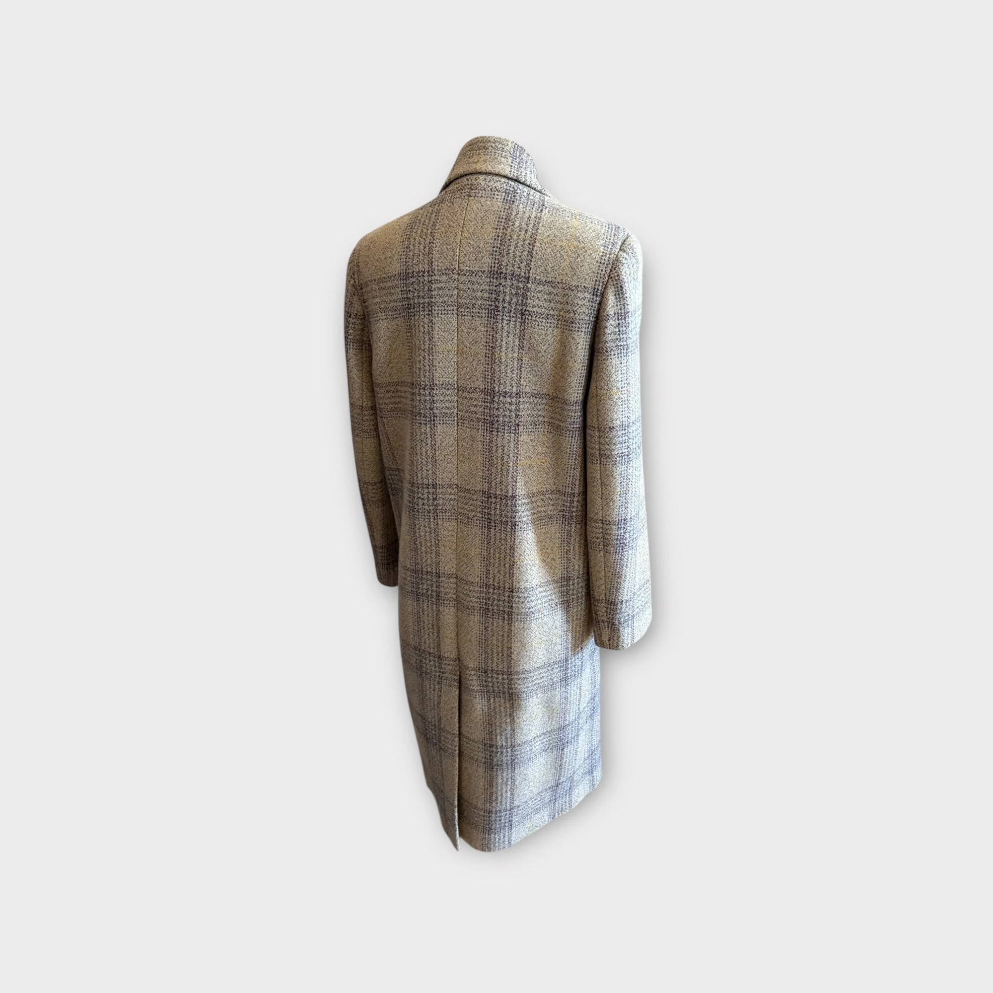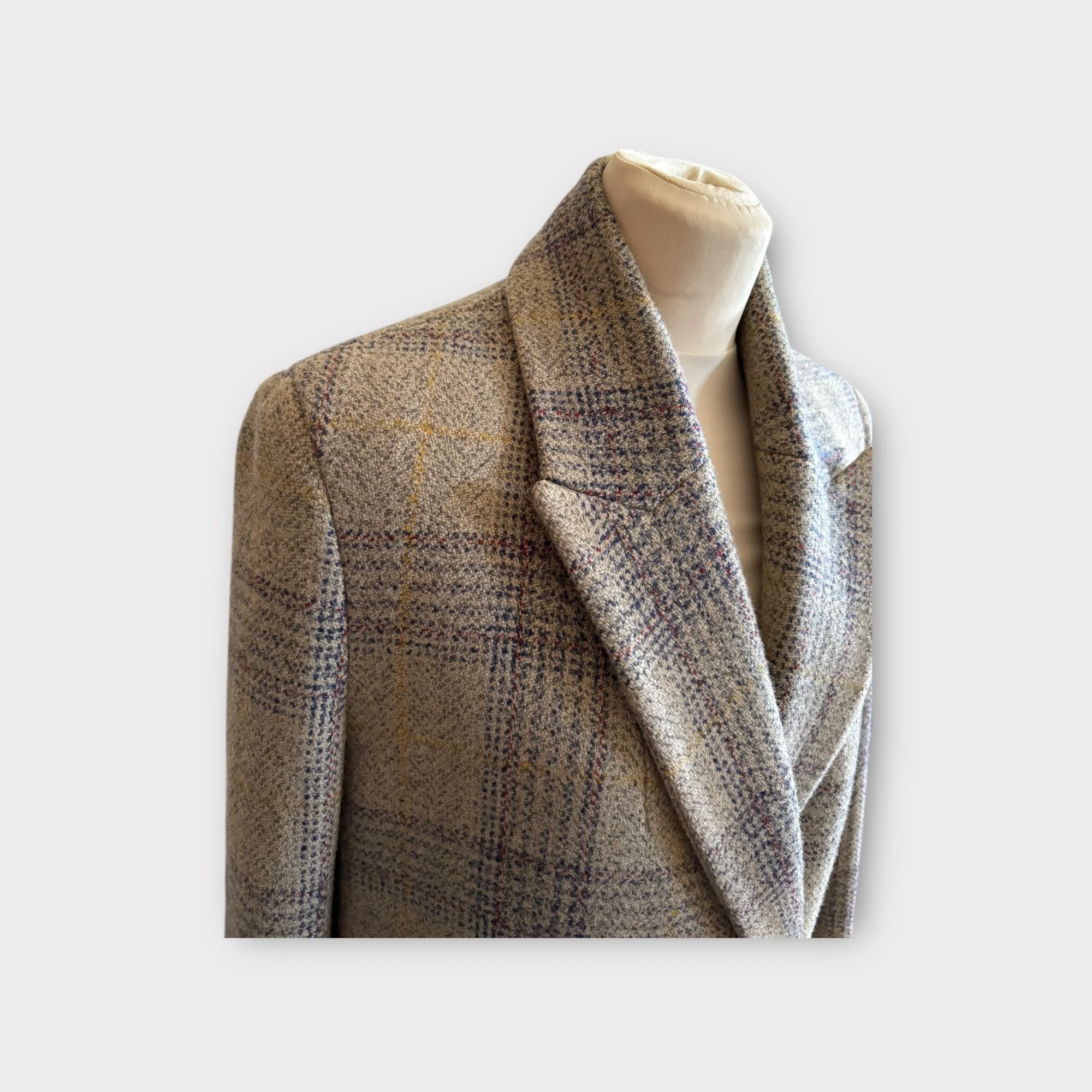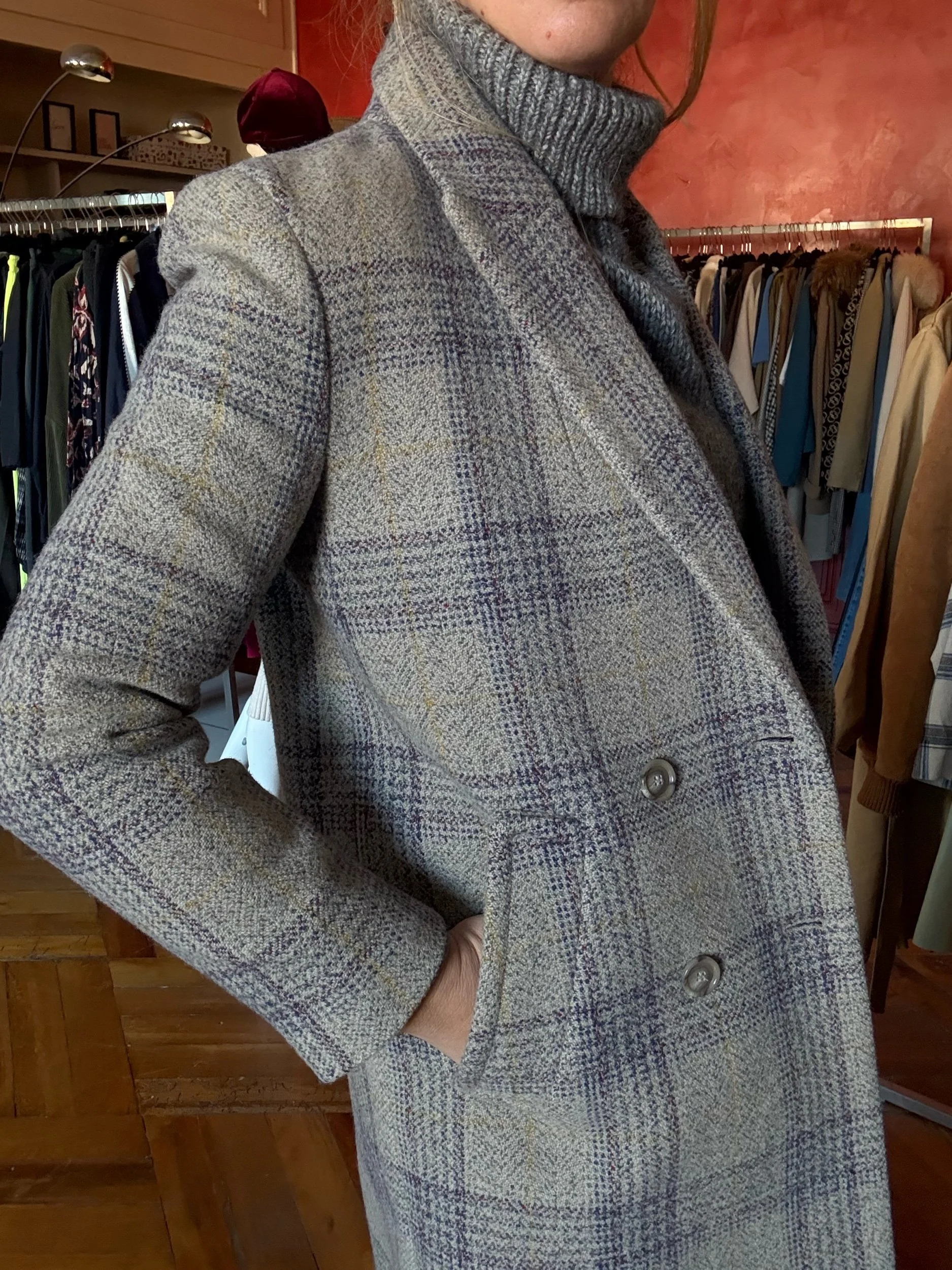 Manteau en laine coloris grège à gros carreaux marine et bordeaux avec une ligne de jaune
