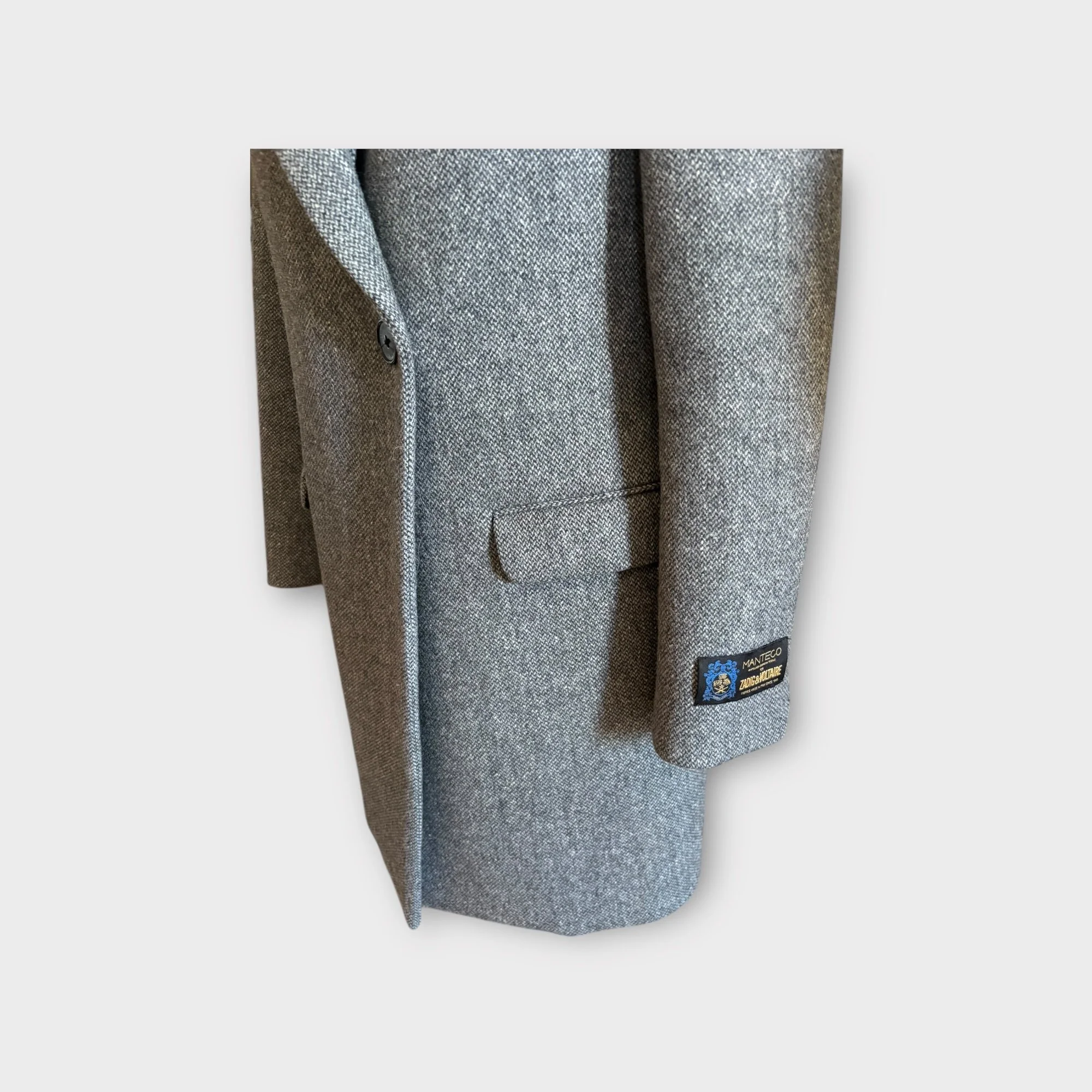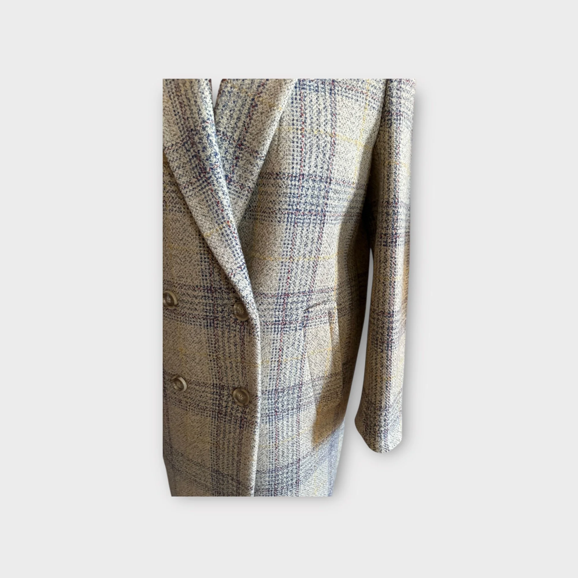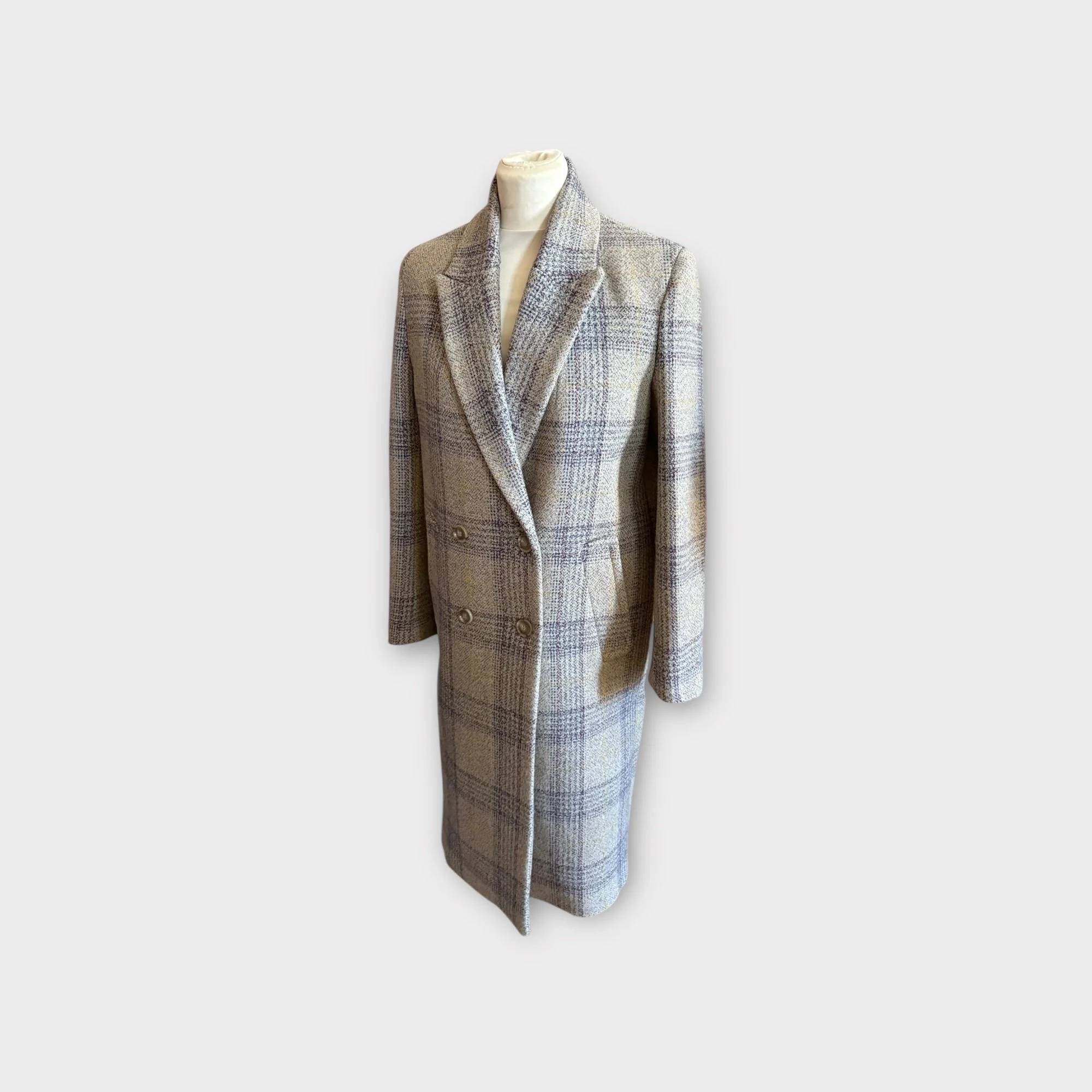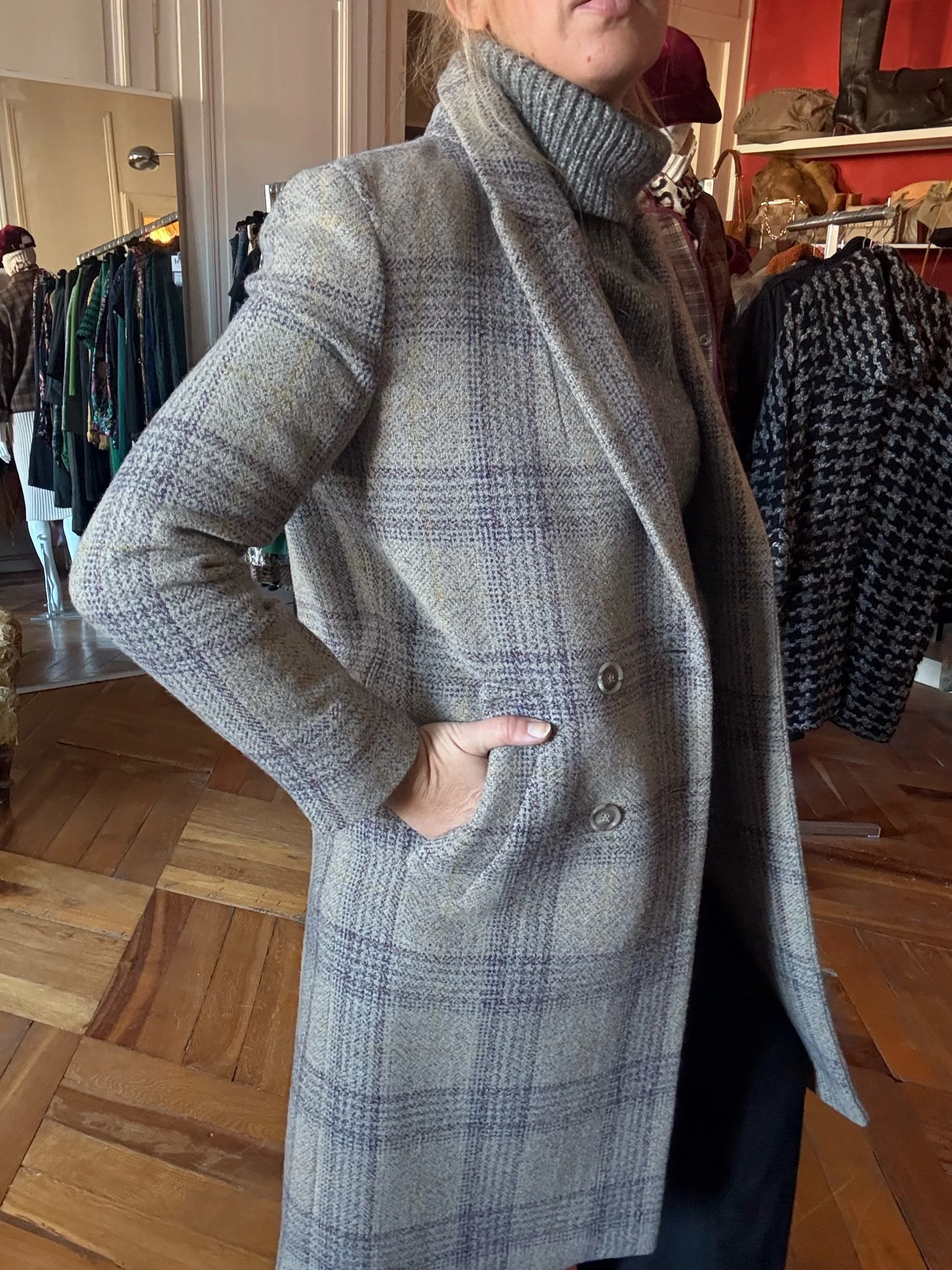 Manteau en laine coloris grège à gros carreaux marine et bordeaux avec une ligne de jaune