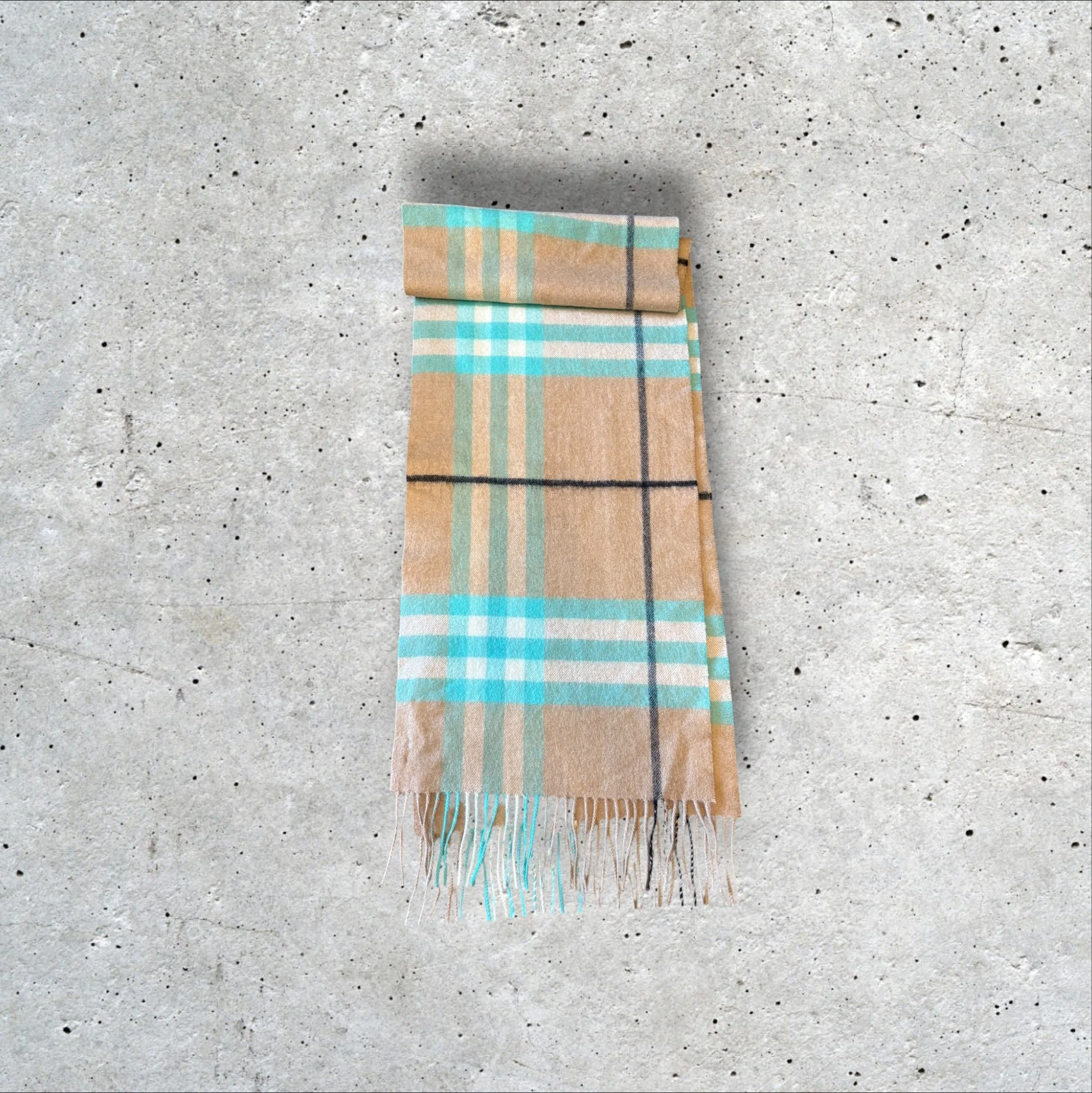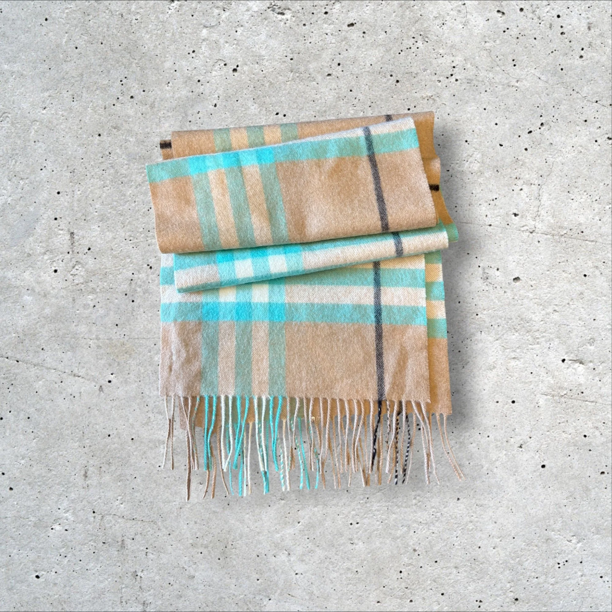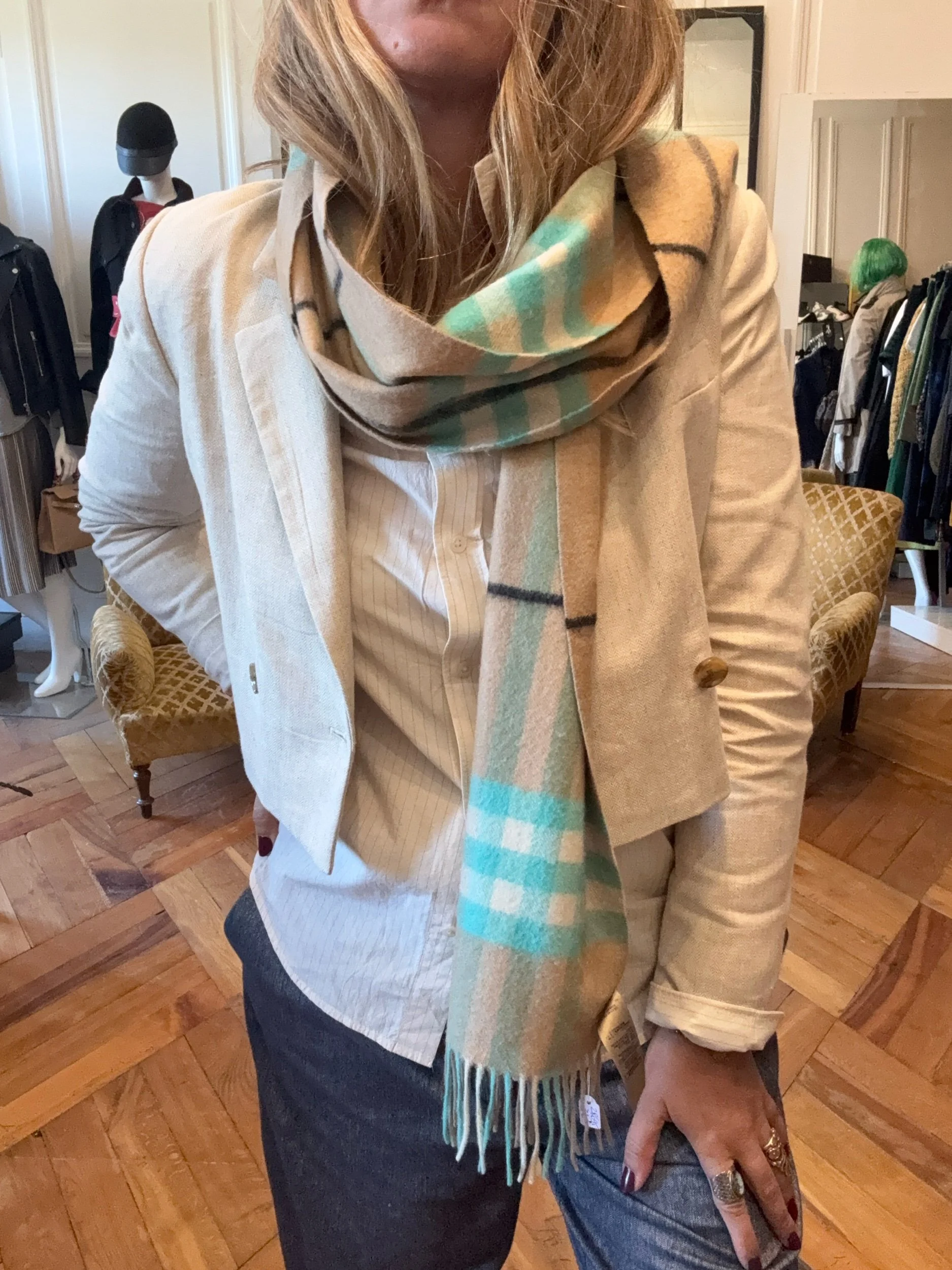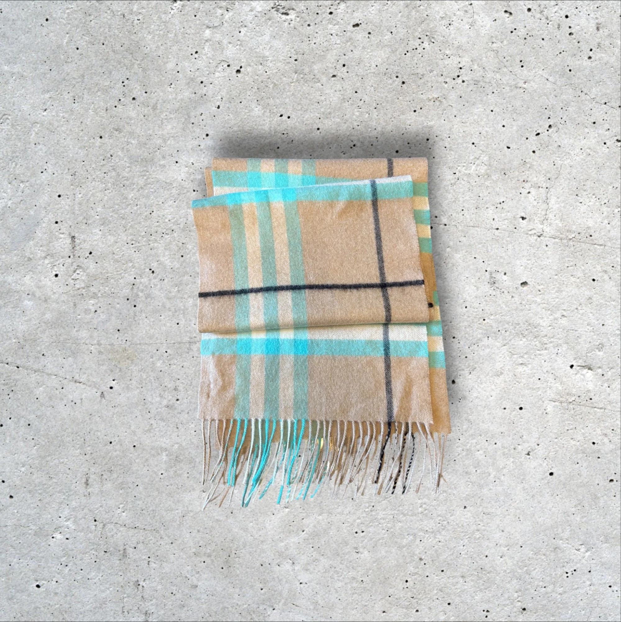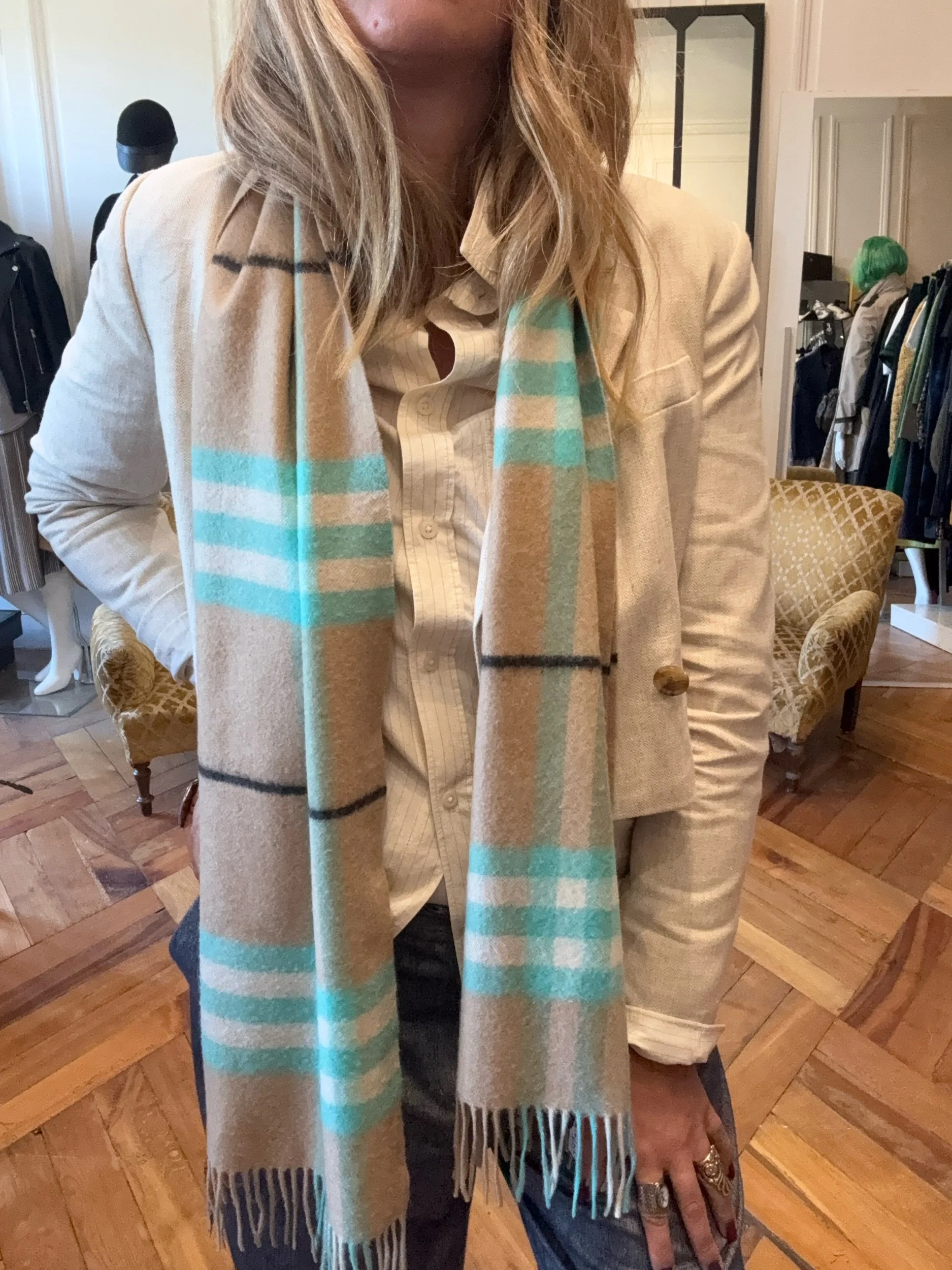 Echarpe en cachemire à carreaux beige, écru et turquoise