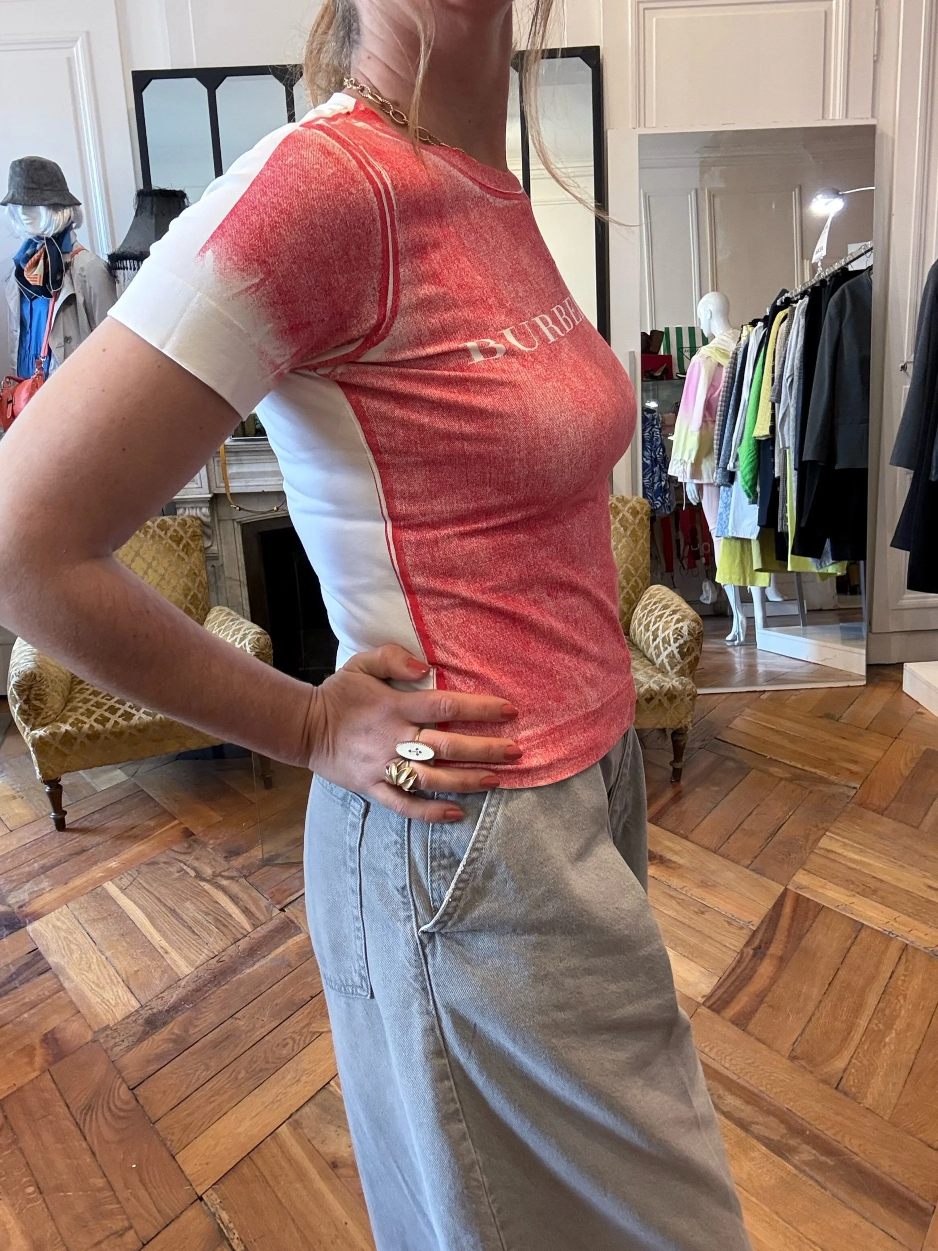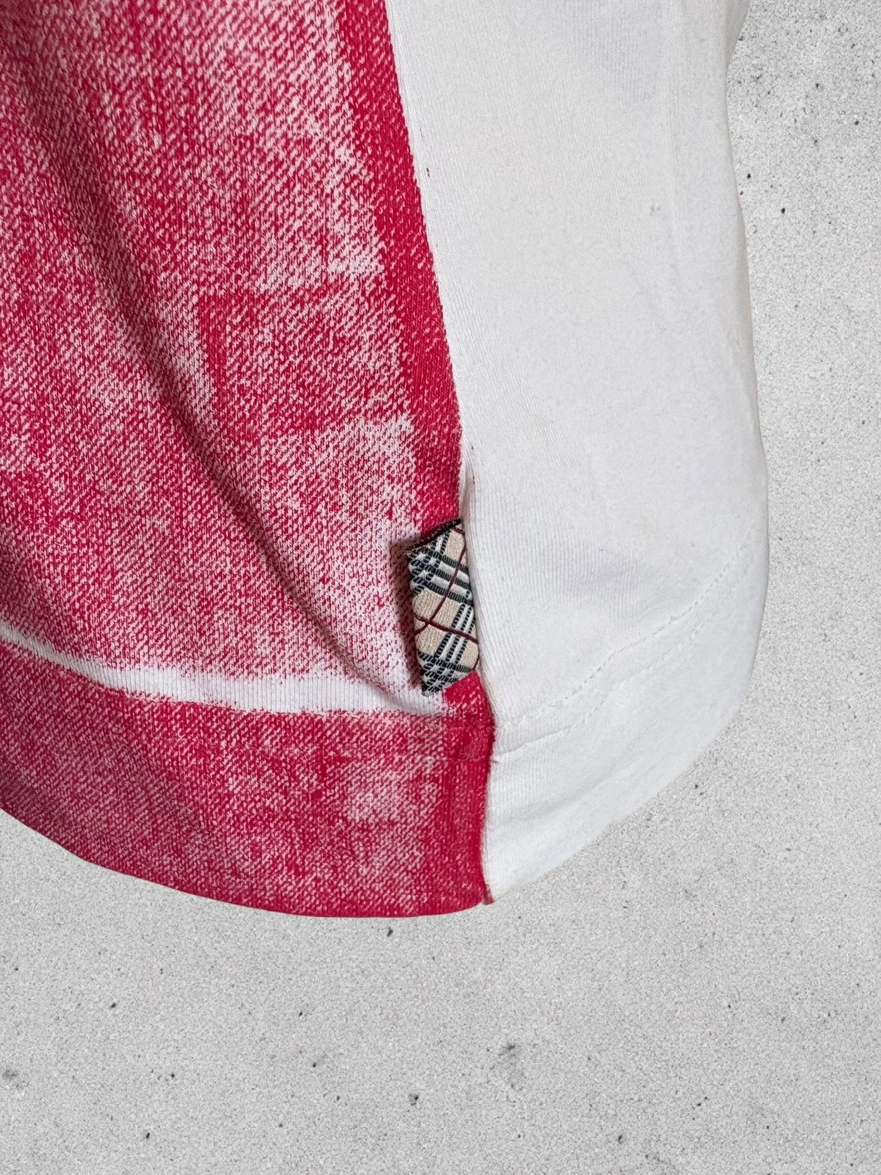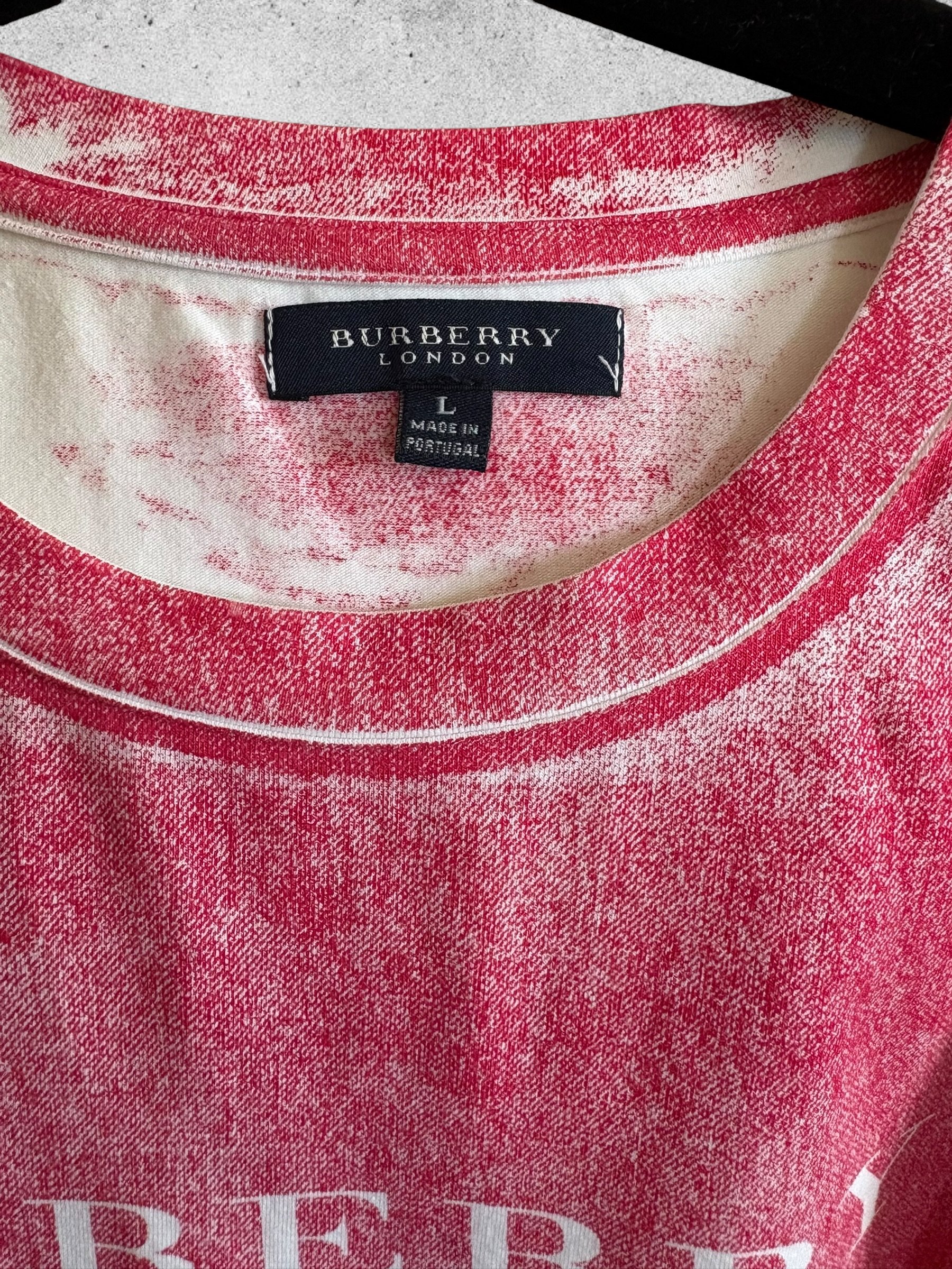 Impression BURBERRY sur la poitrine sur fond rouge