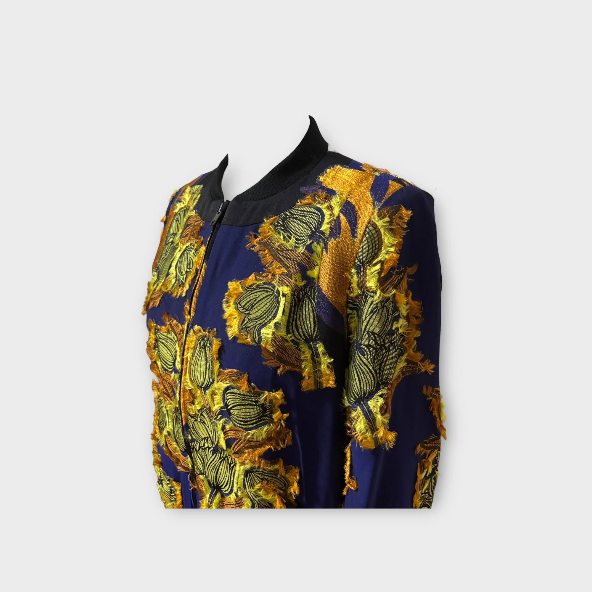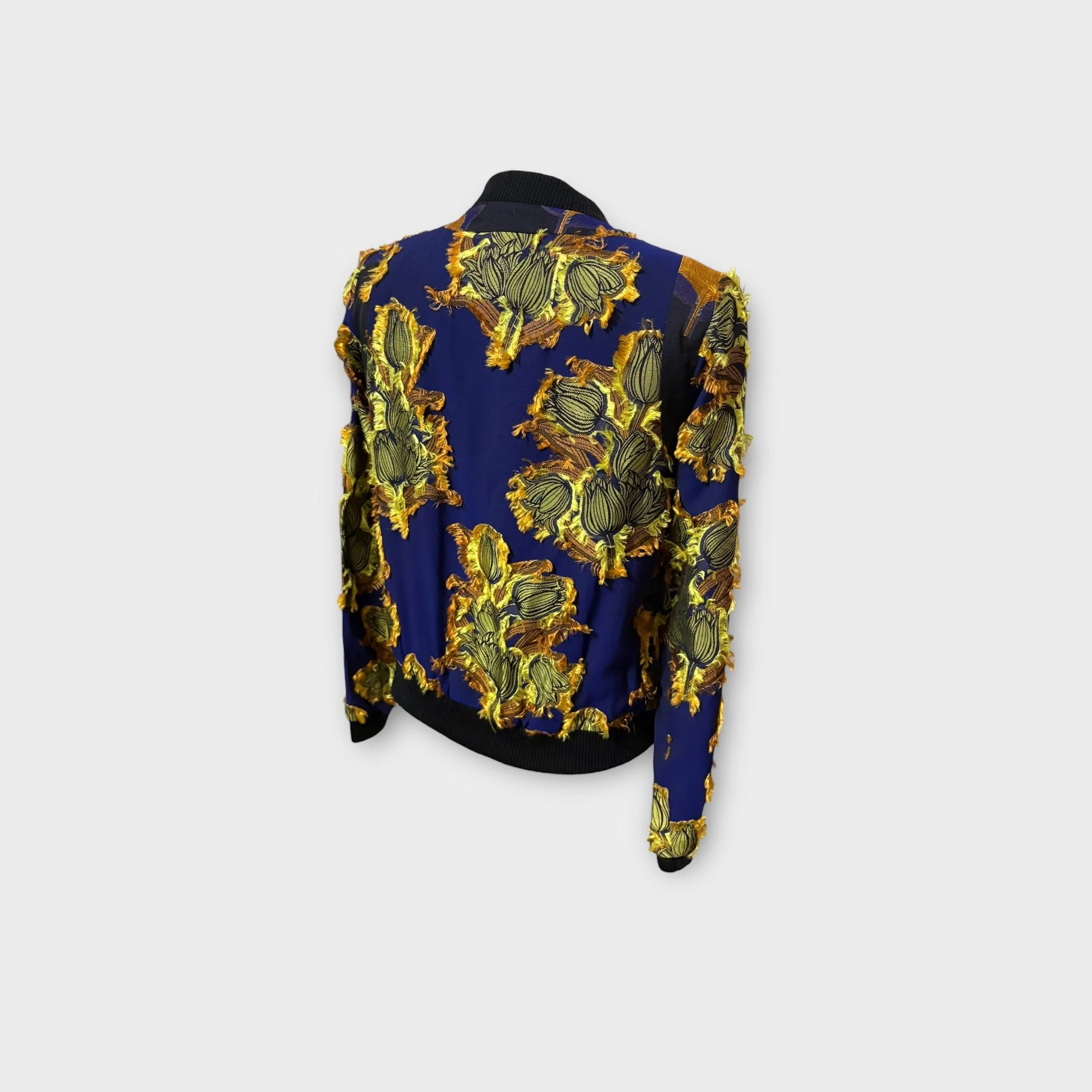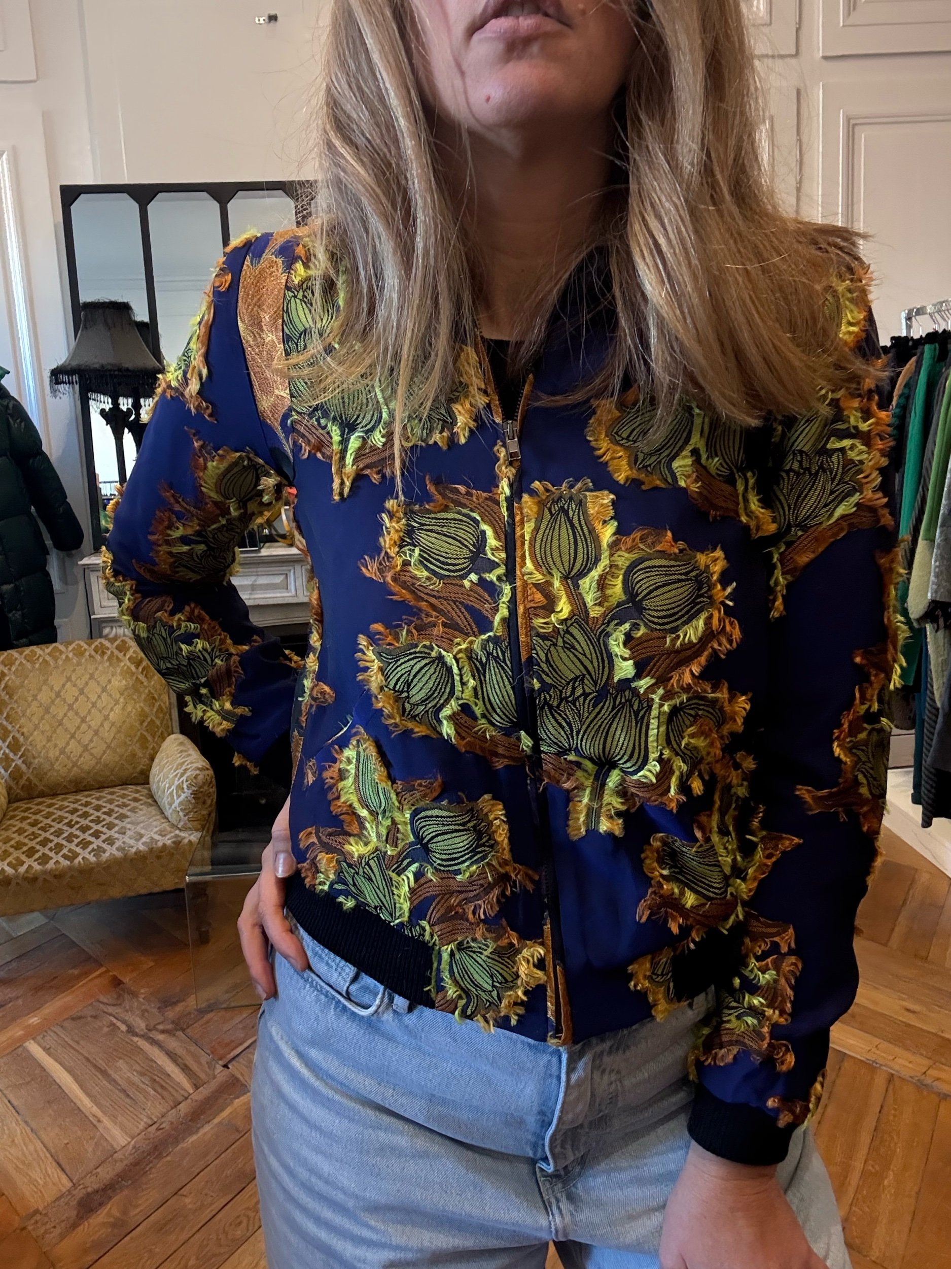 Bomber en tissu marine avec empiècement floral reliéfé coloris cuivré et lemon