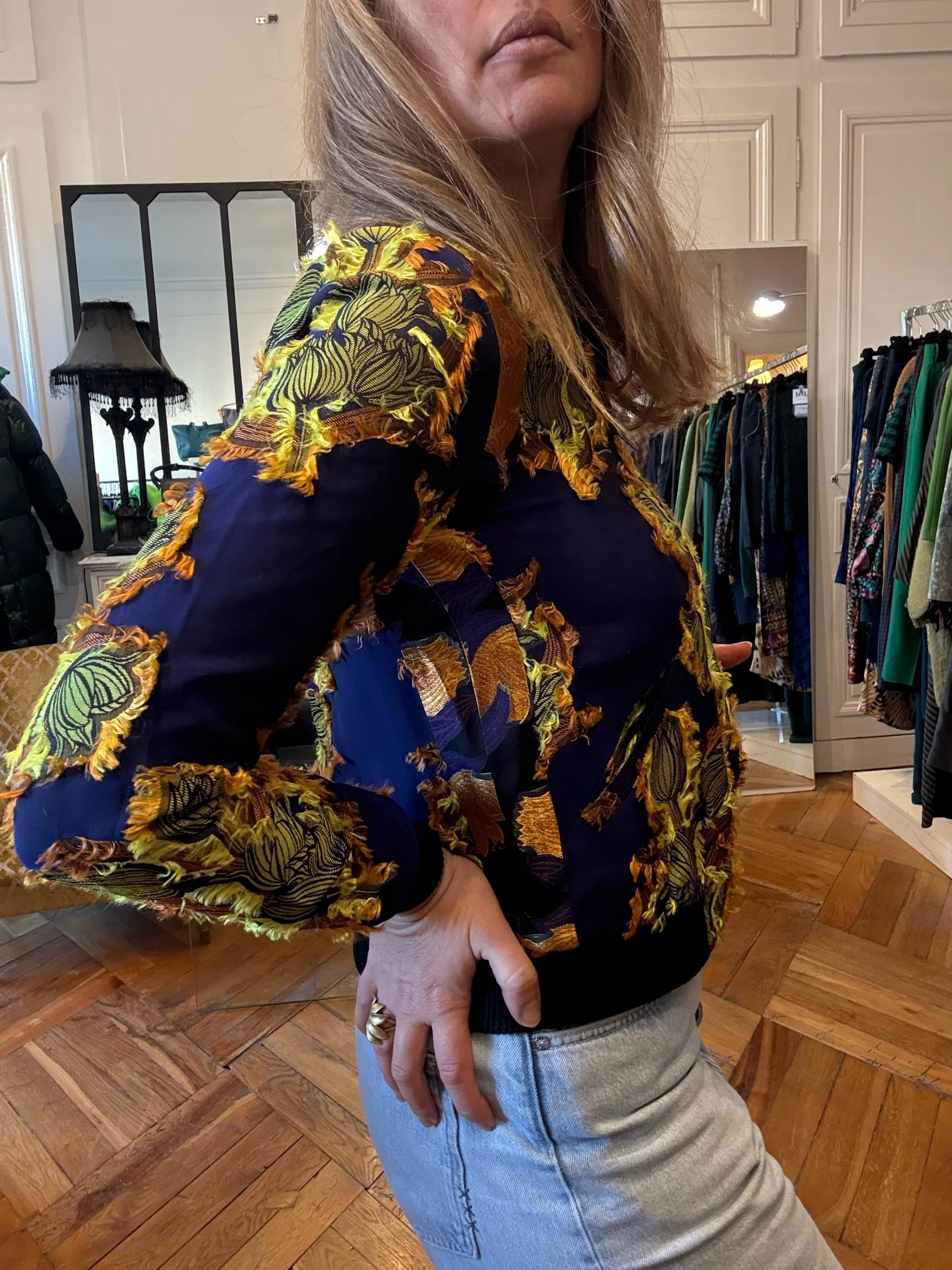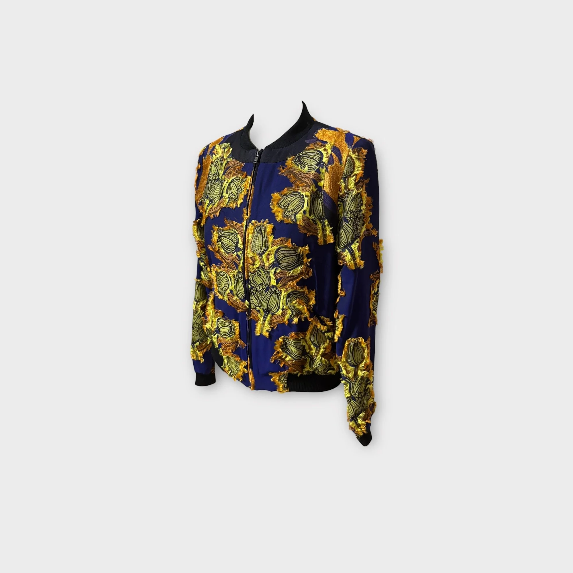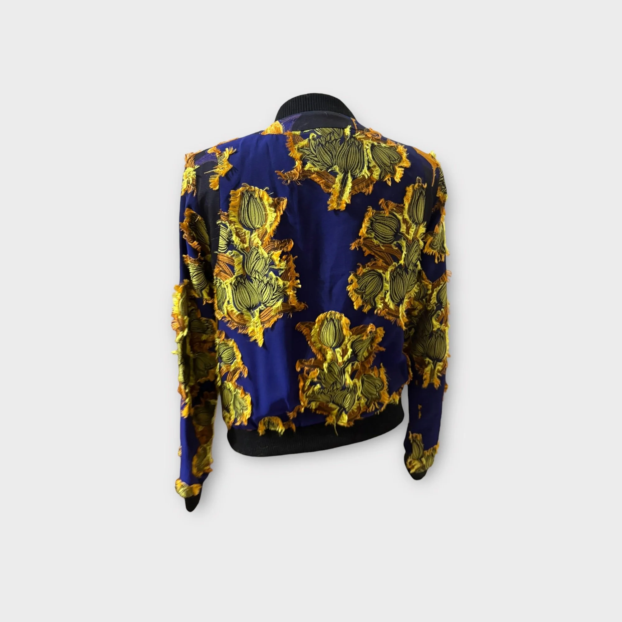 Bomber en tissu marine avec empiècement floral reliéfé coloris cuivré et lemon