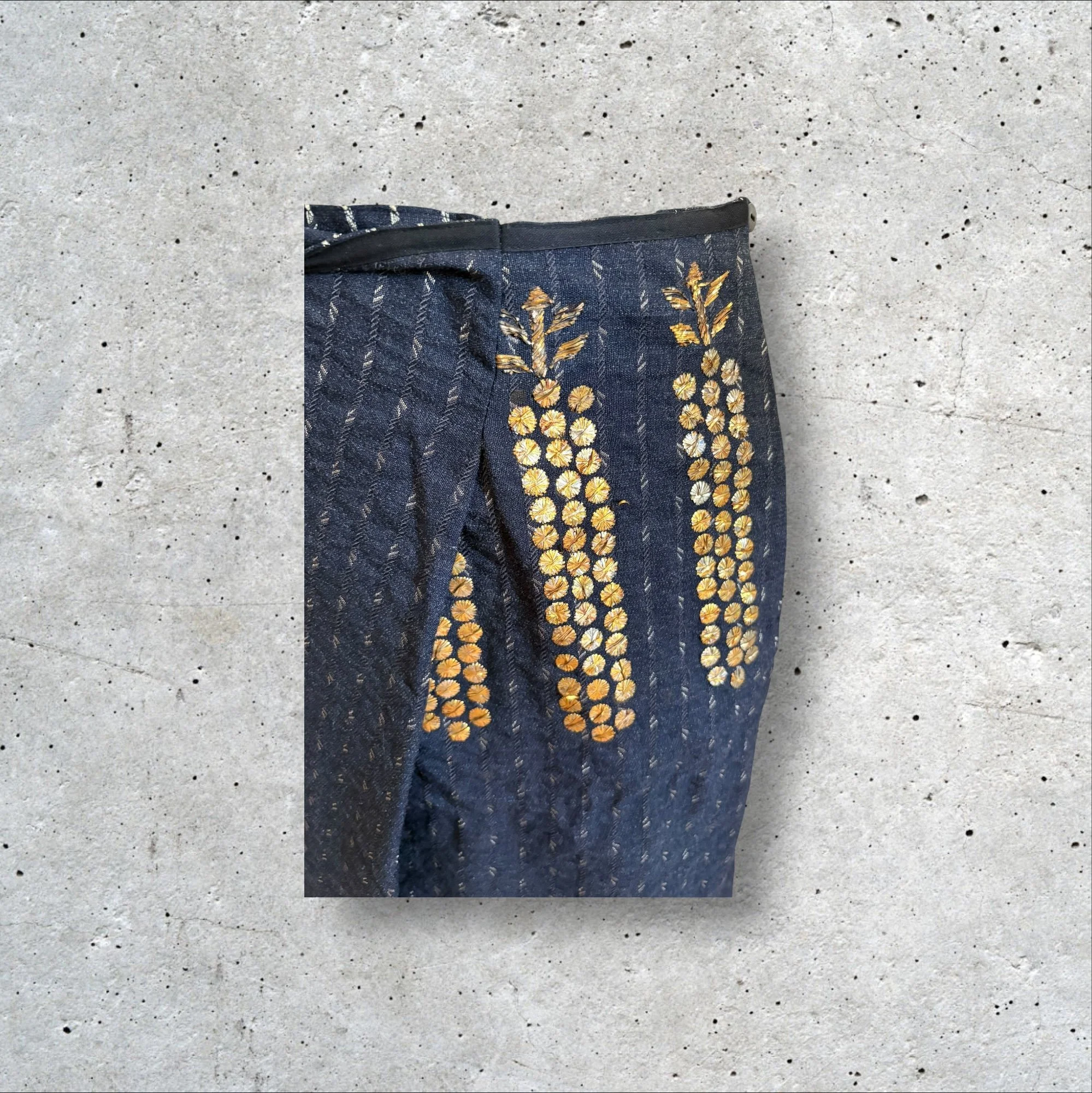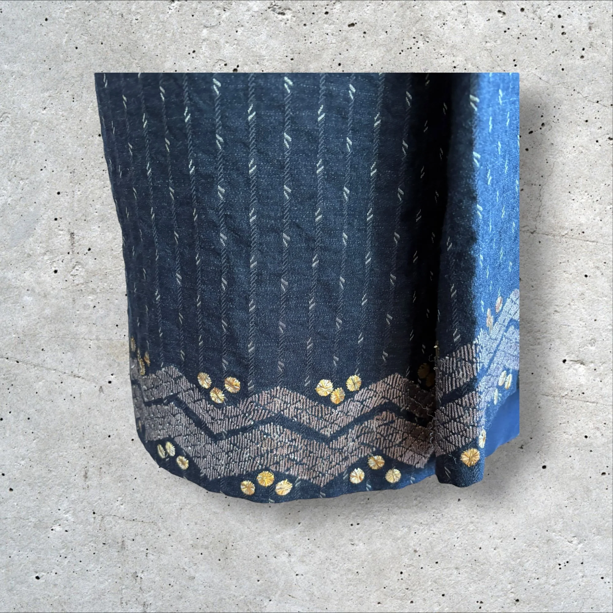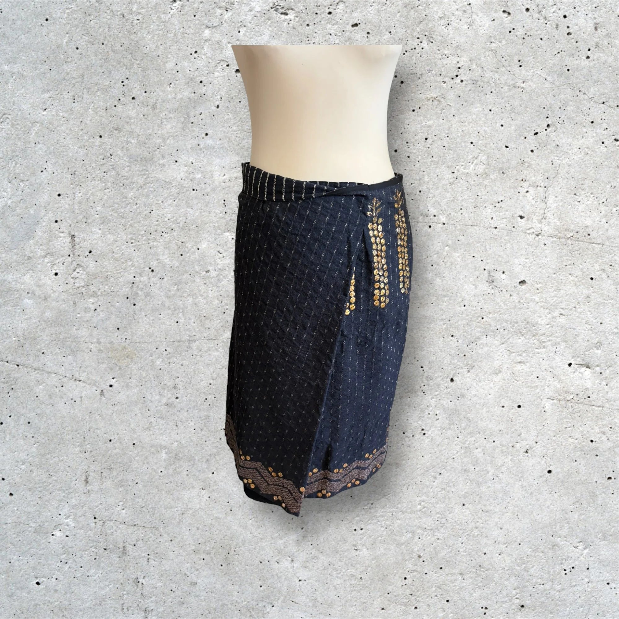 Jupe midi faussement portefeuille en lainage gris brodé et rebrodée de fil lurex doré et galon cuivré zig zag