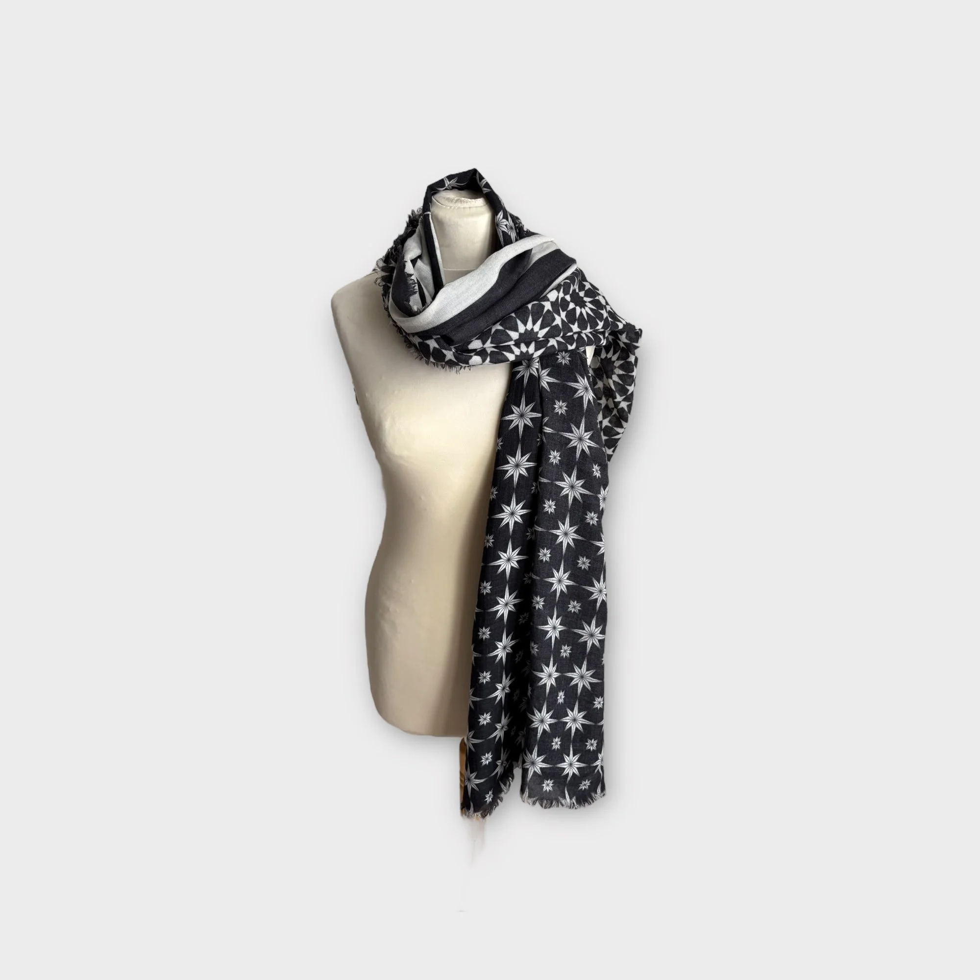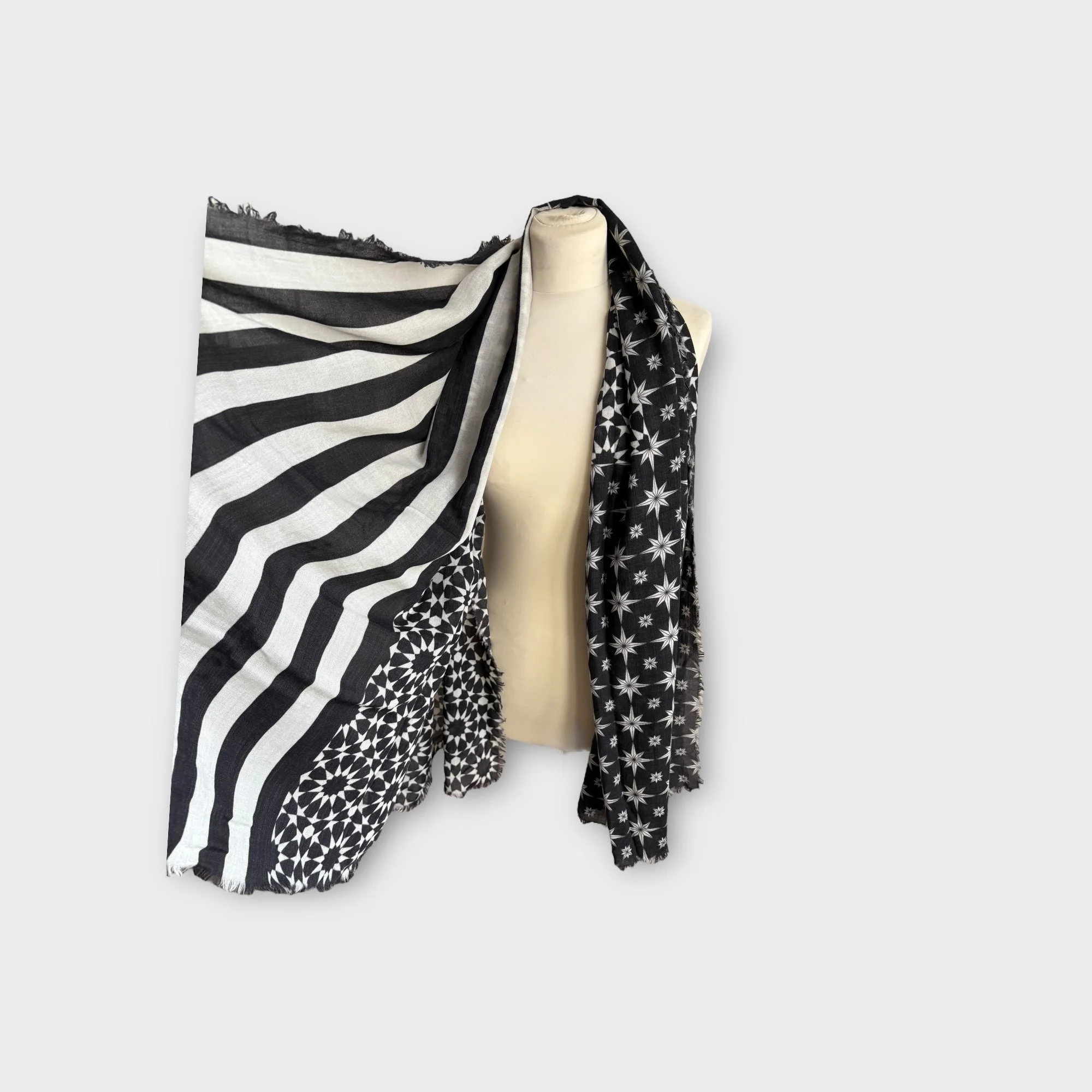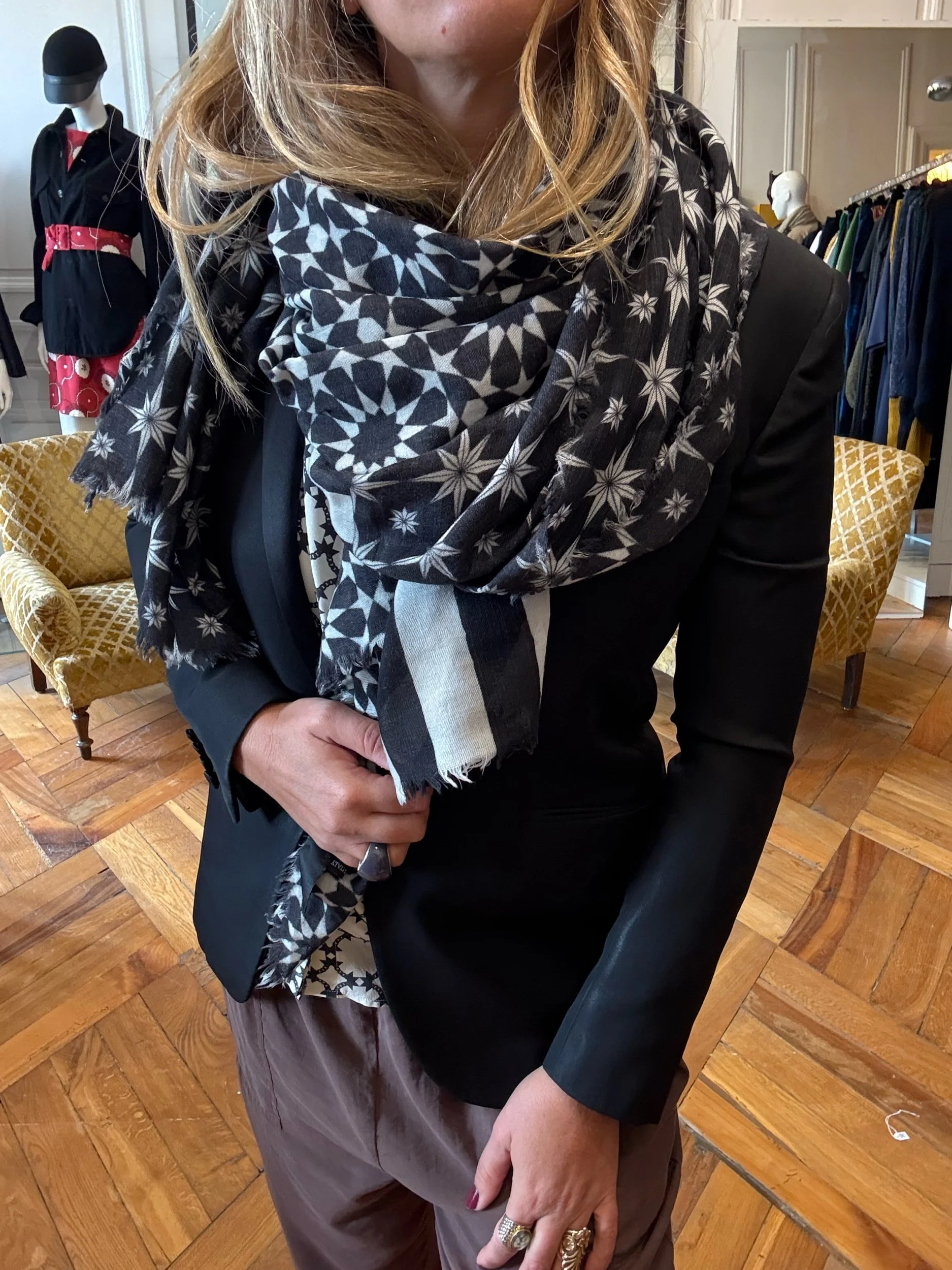 Le + selon ADM: L’écharpe XXL noire et blanche géométrique en étamine de laine un MUST HAVE de votre armoire