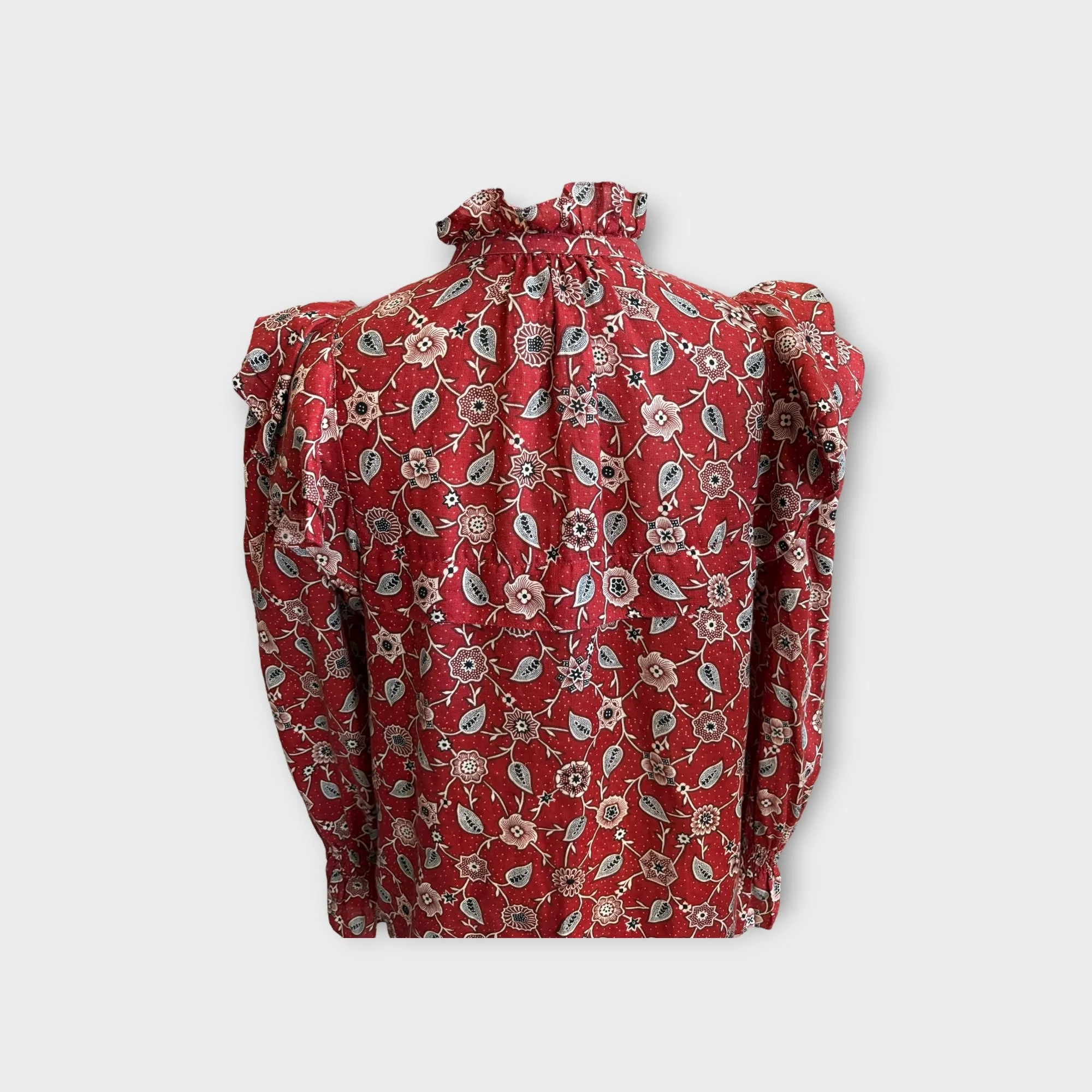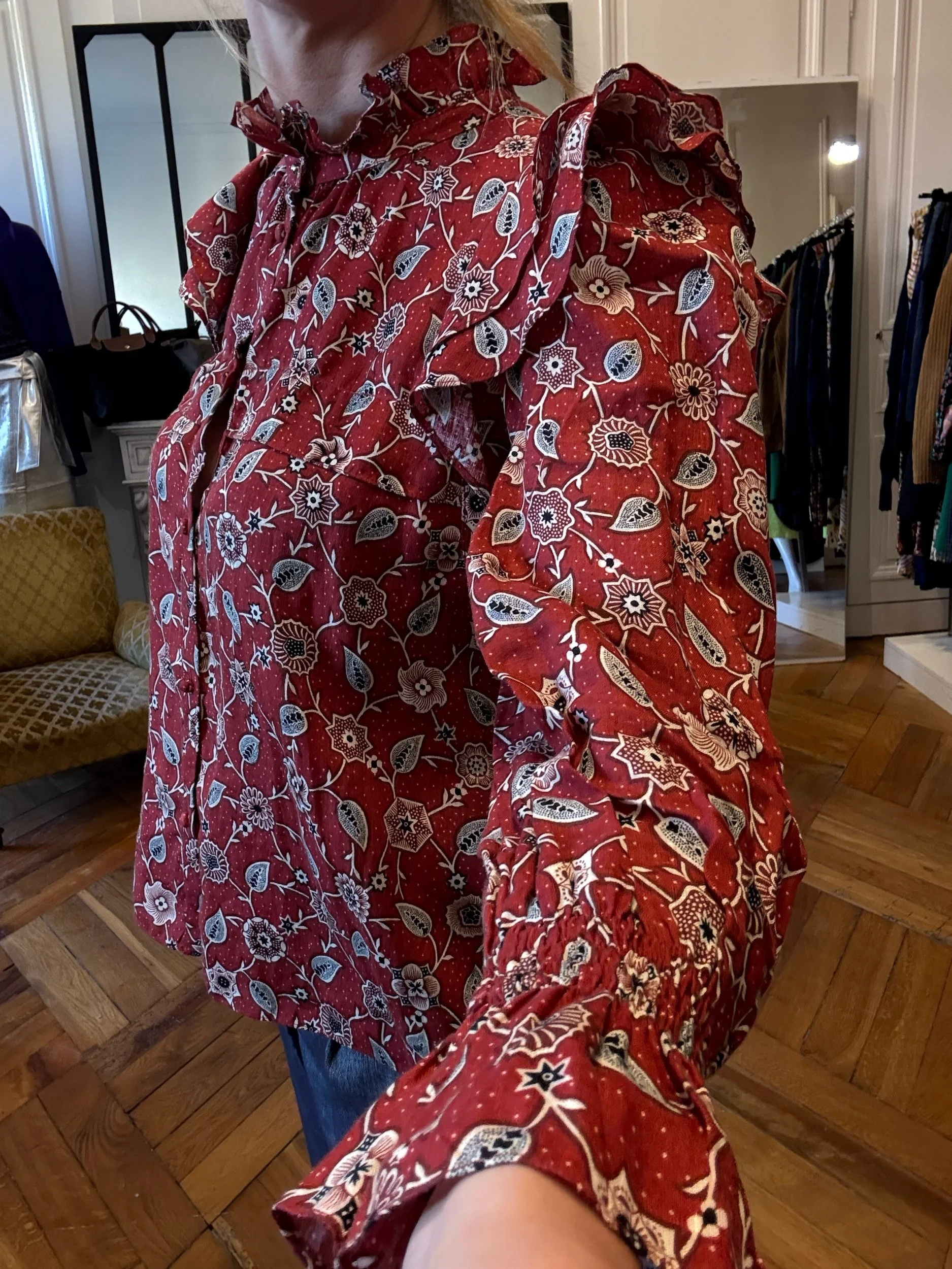 Chemise à volants et col montant en lin épais imprimé rouge terre brulee et écru