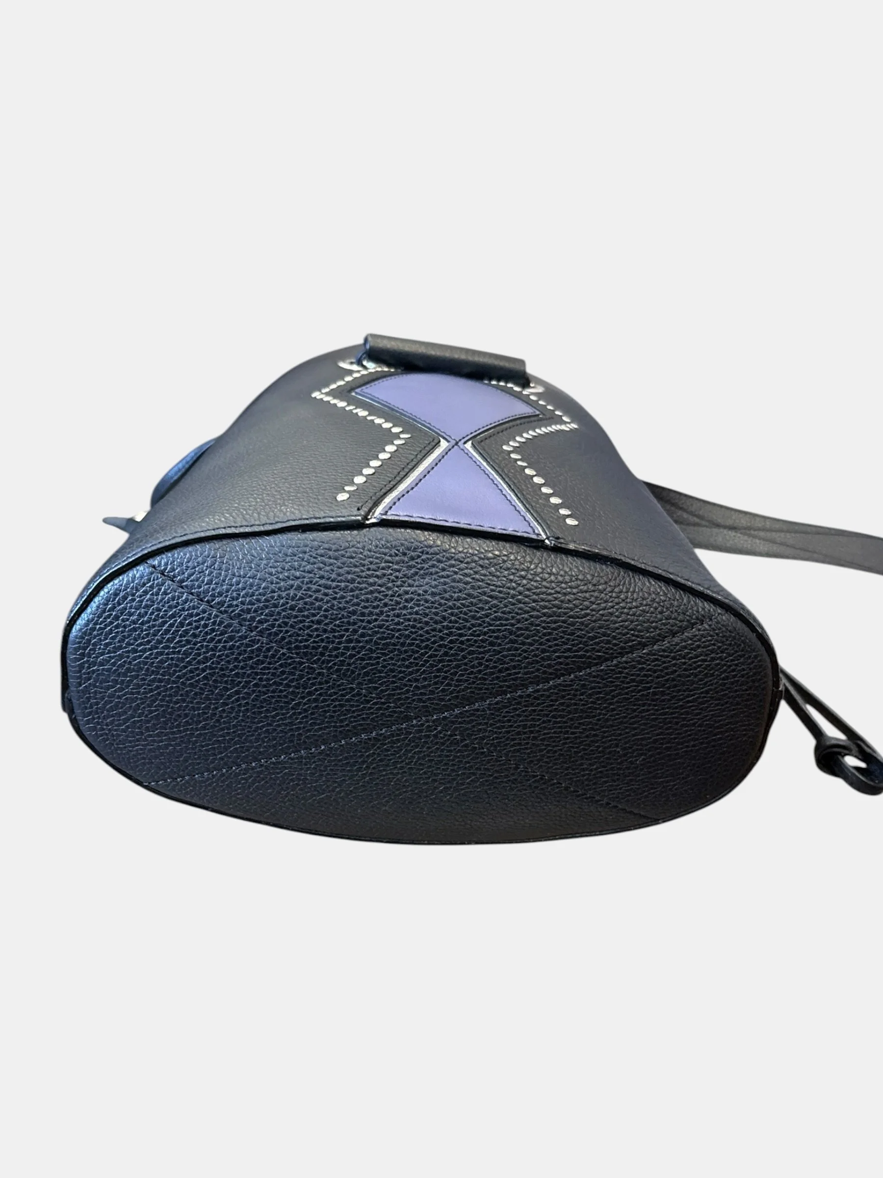 Porté épaule ou croisé par la bandoulière en cuir réglable bi colore 1 face noire et 1 face lavande