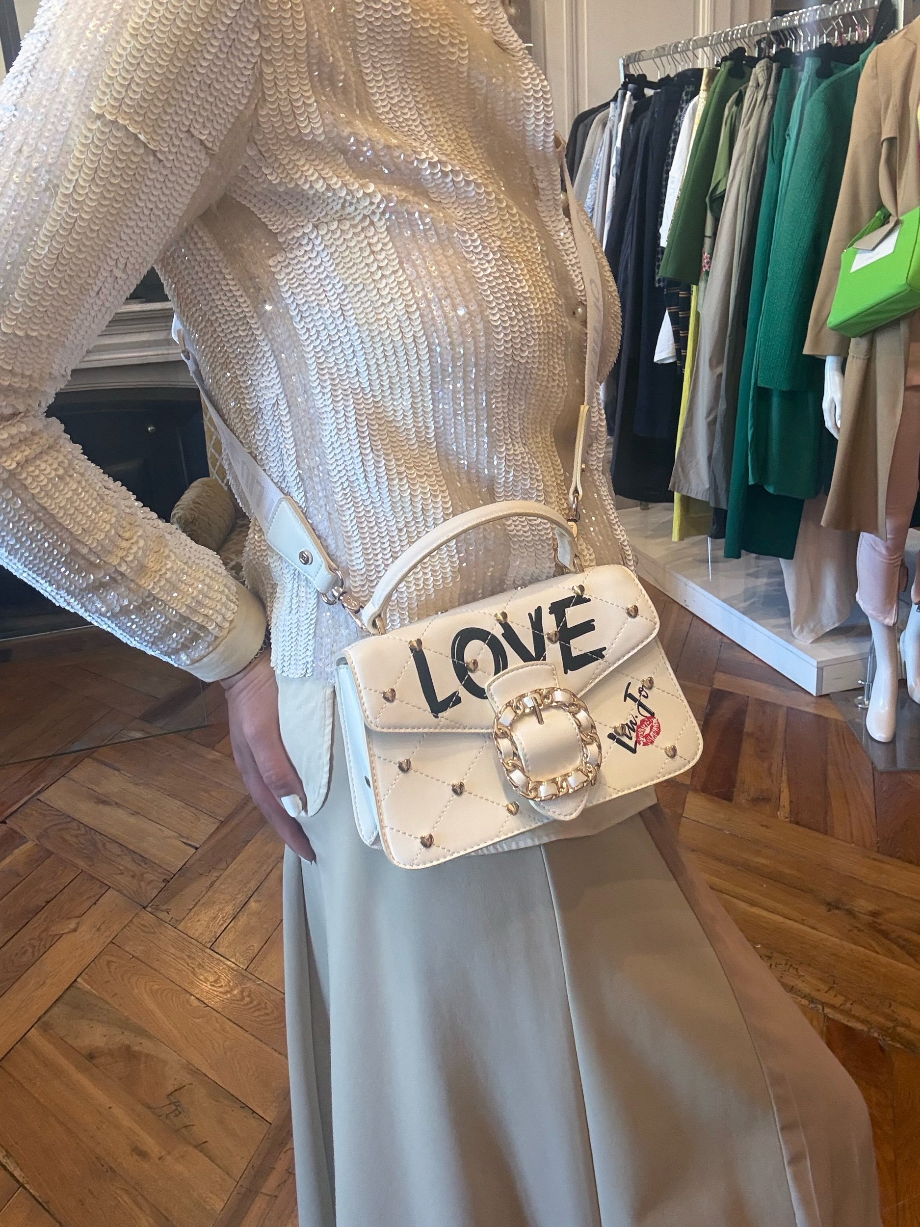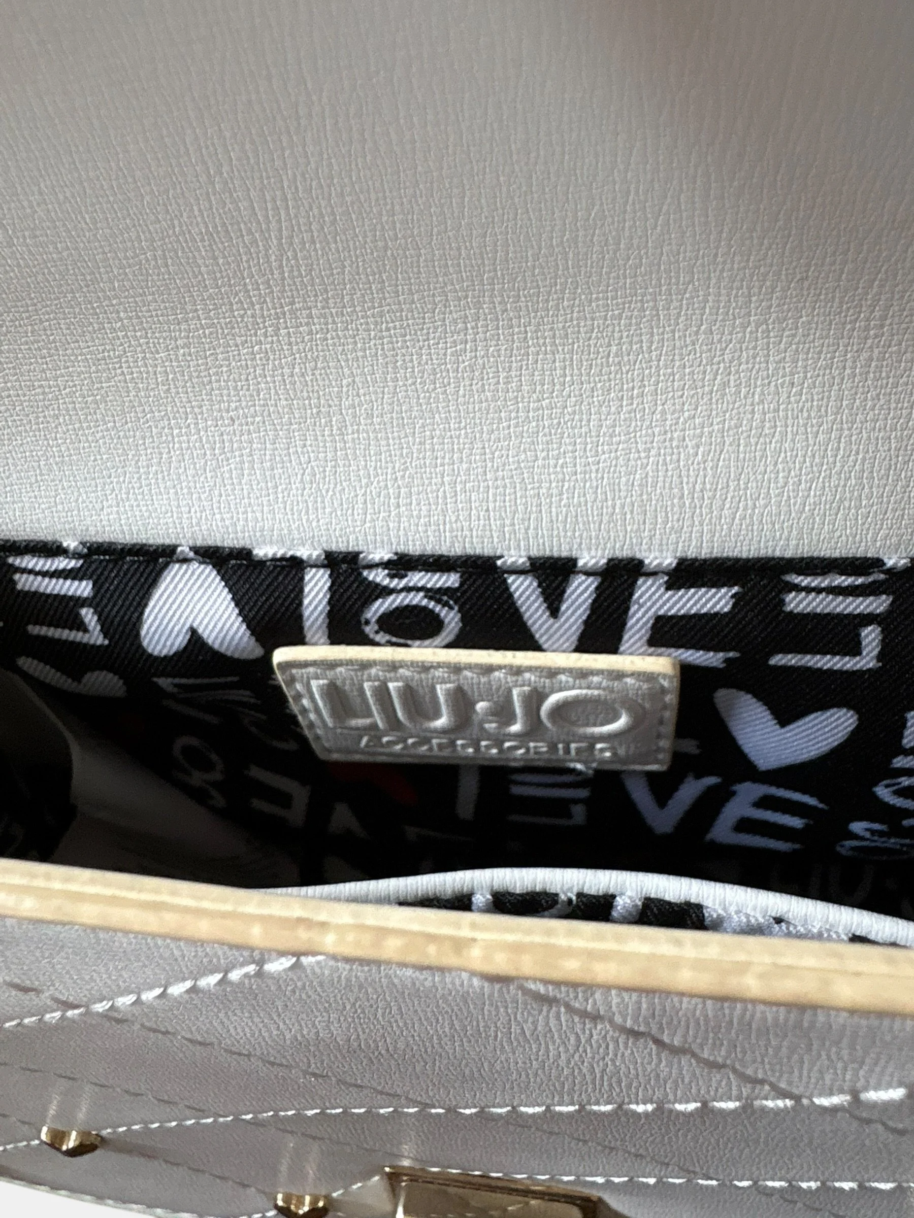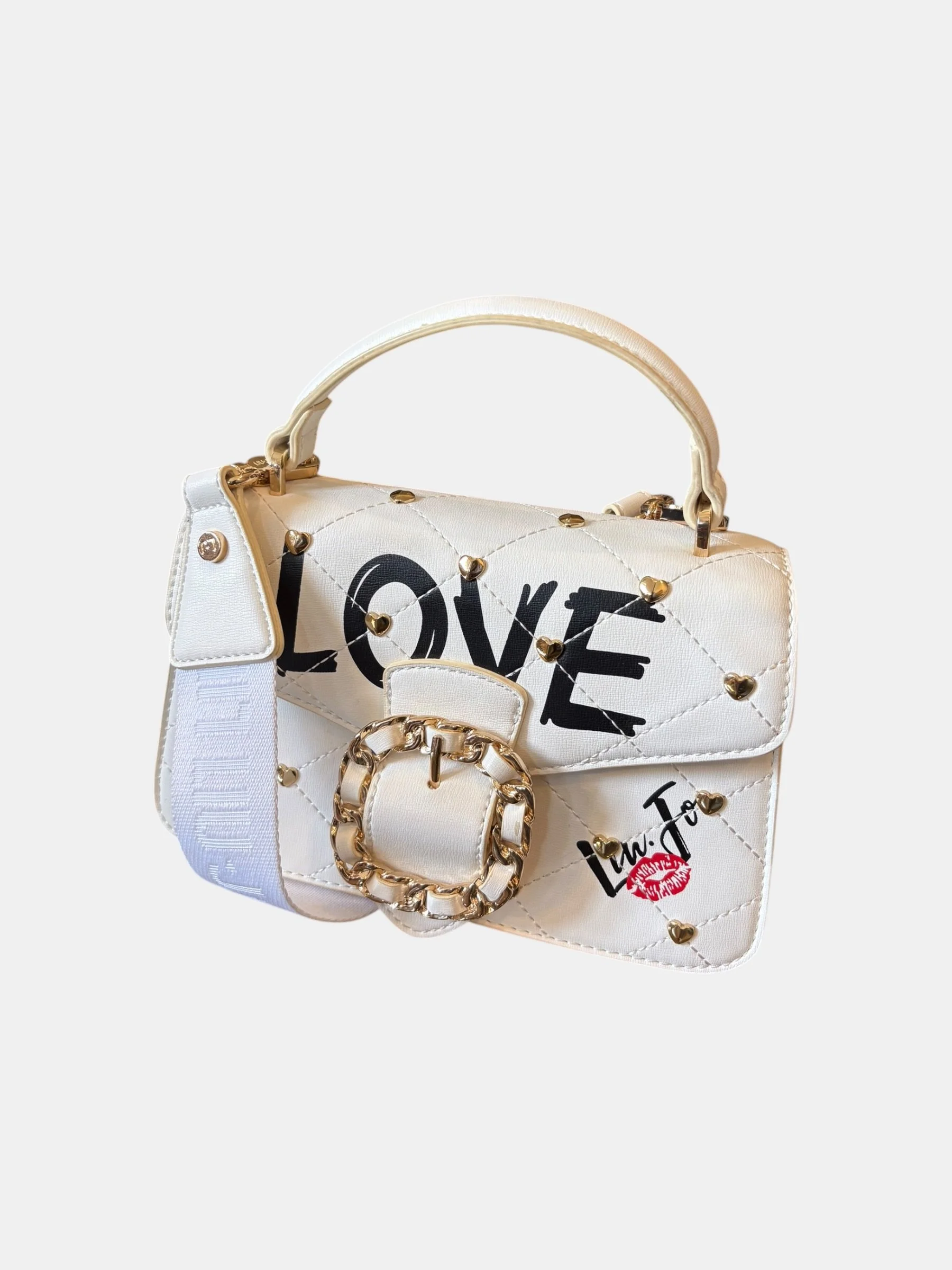 Porté épaule ou croisé par la bandoulière en tissu blanc logoté LIU JO ton sur ton amovible et réglable