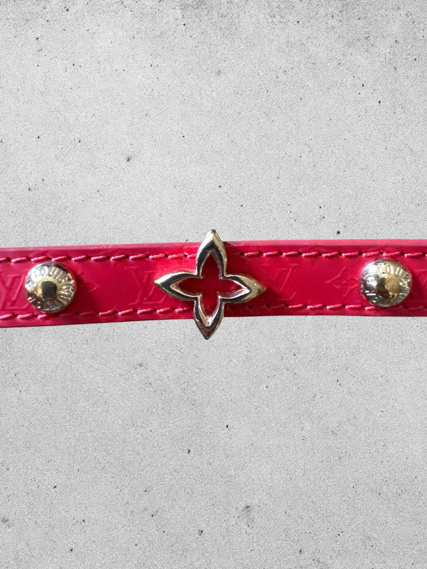 Le corps du bracelet en cuir rouge est réhaussé du monogram LV ton sur ton vernis
