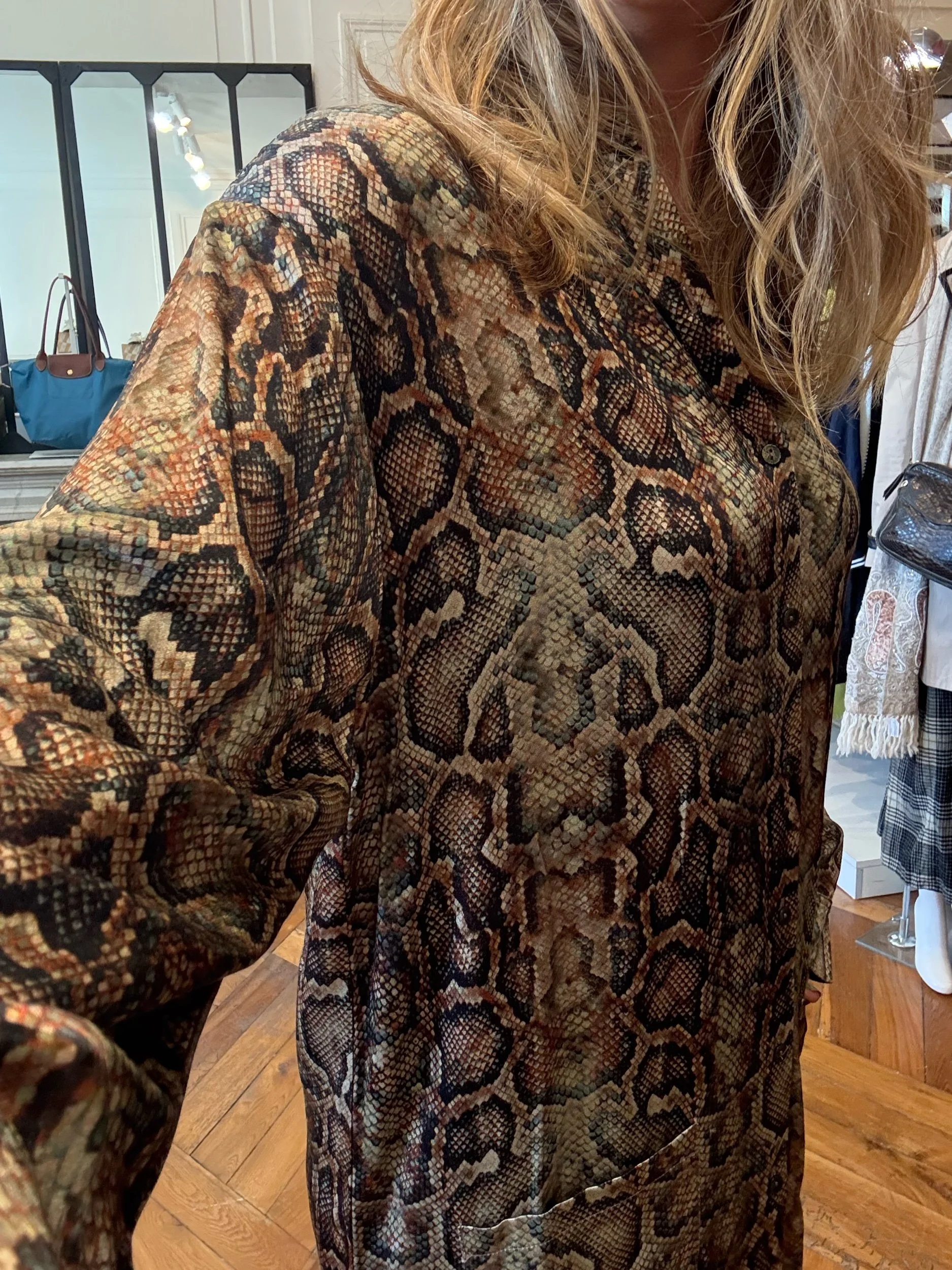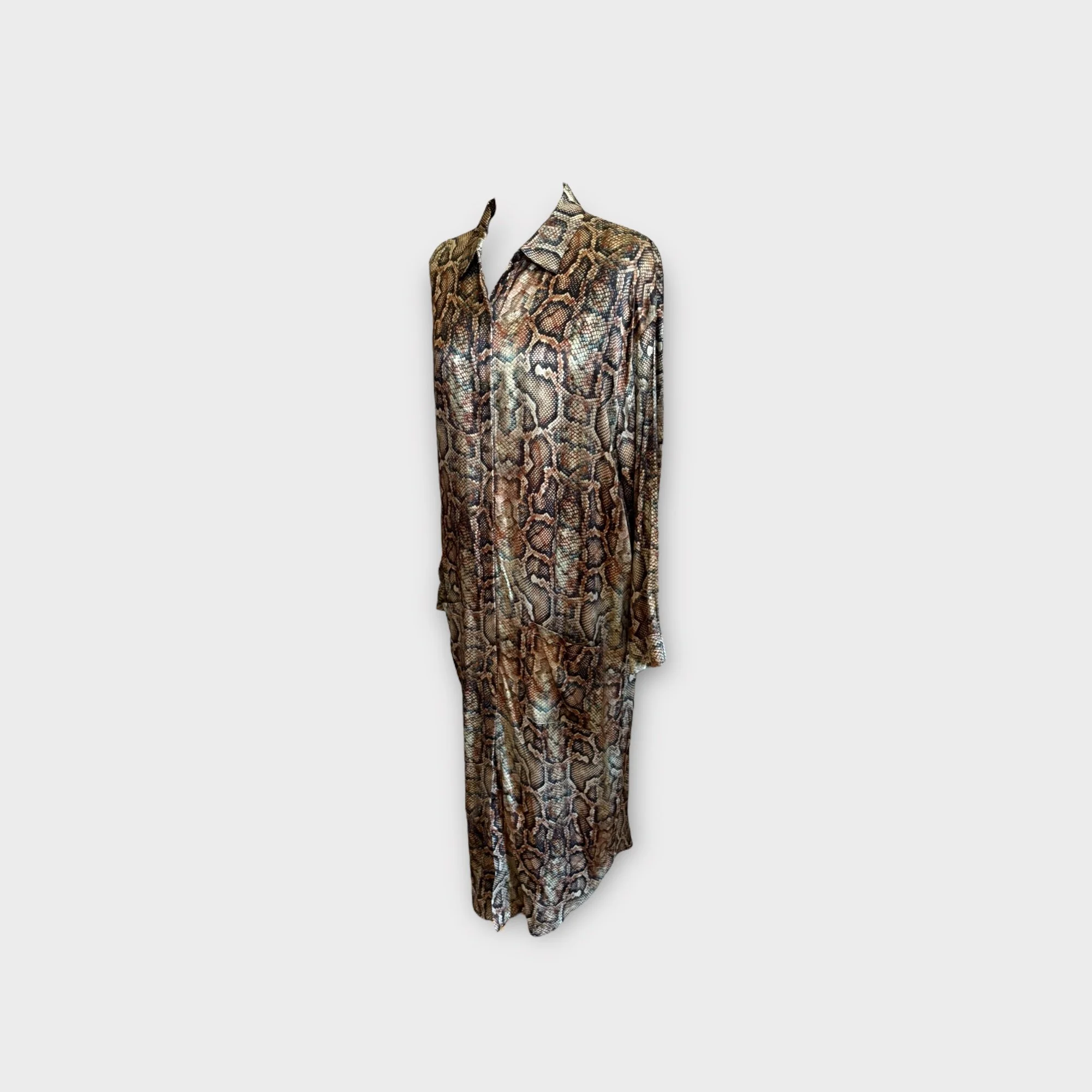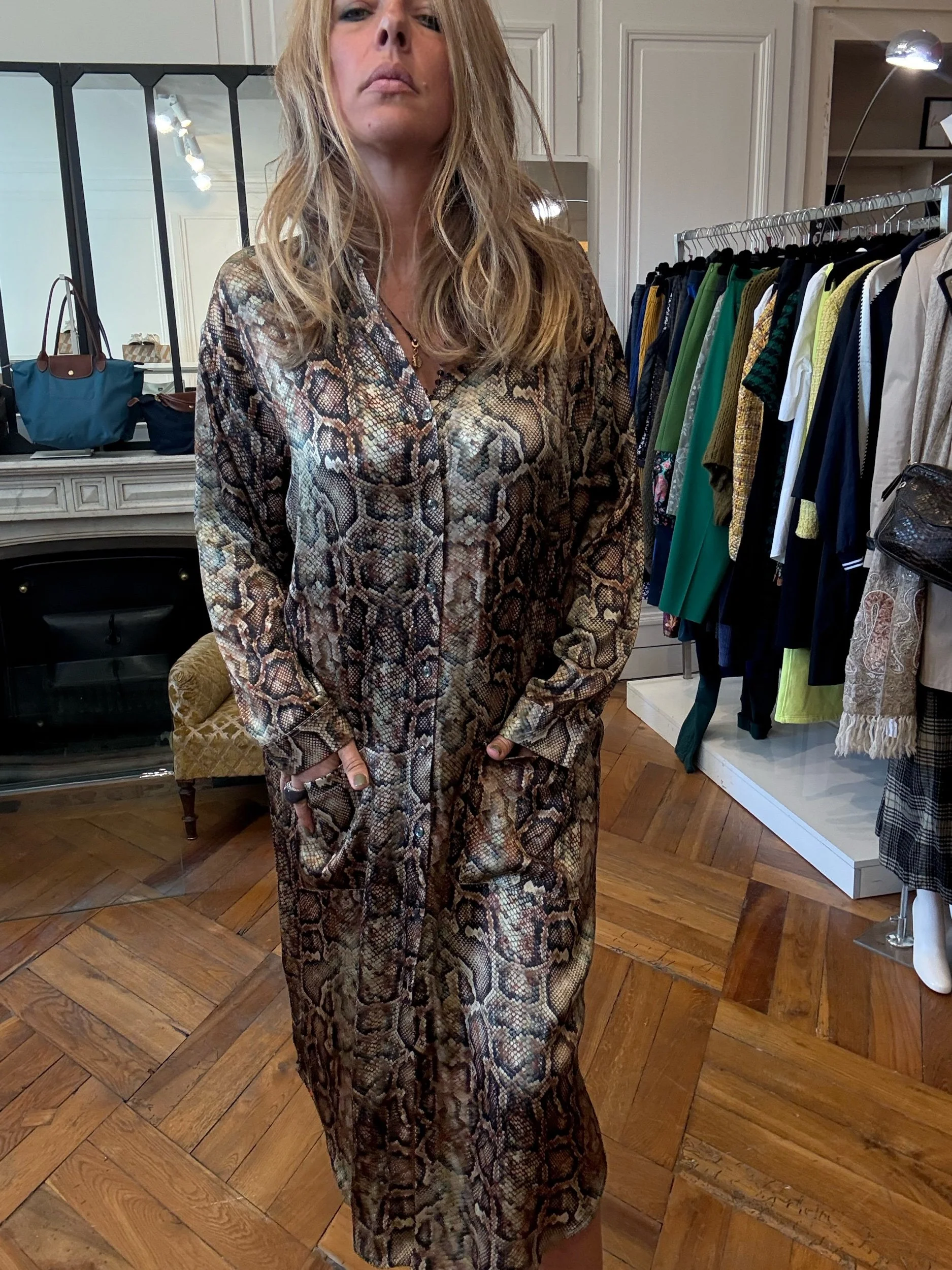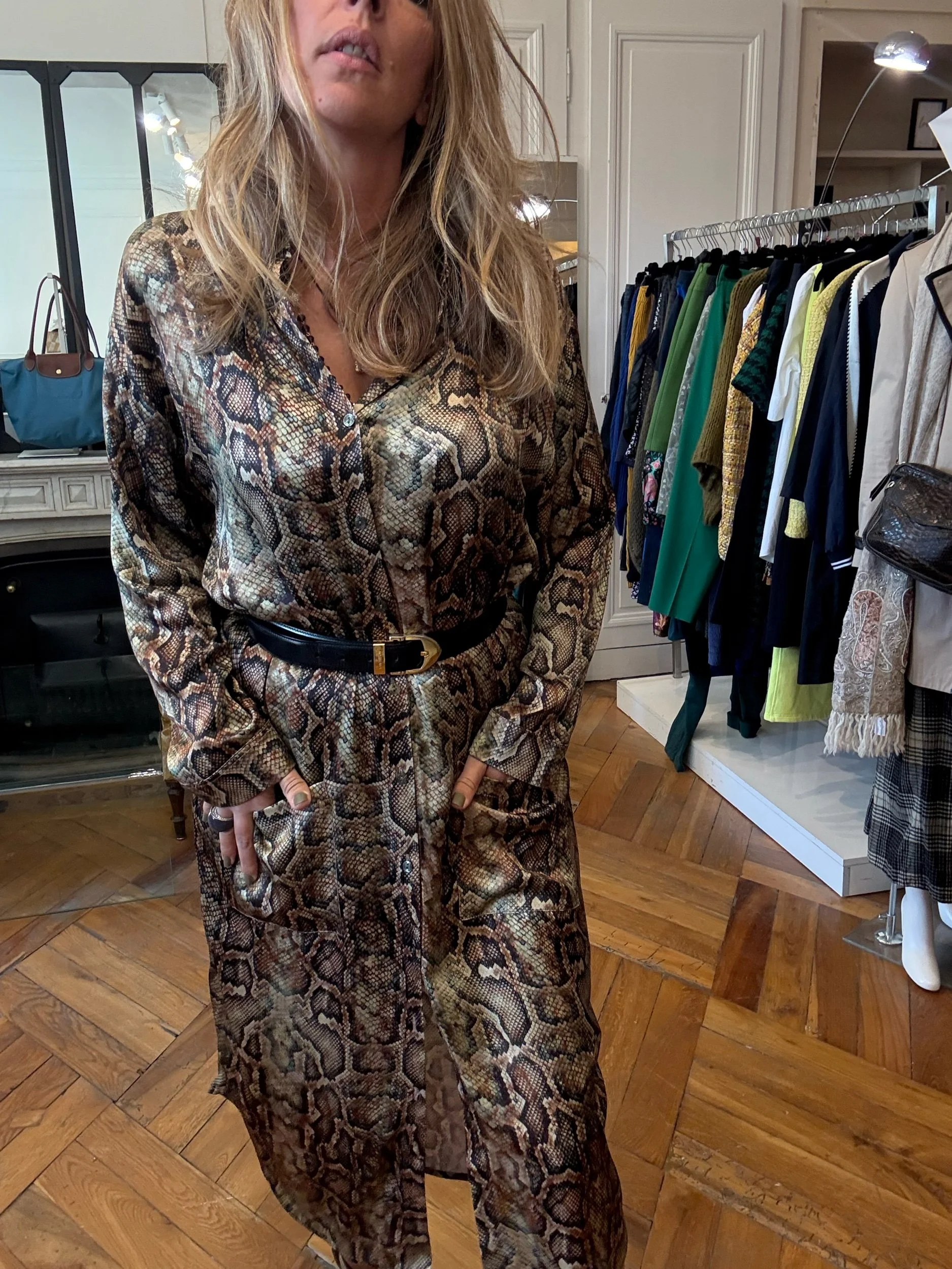 Robe chemise longue imprimé reptile coloris rouille kaki et bleu acier