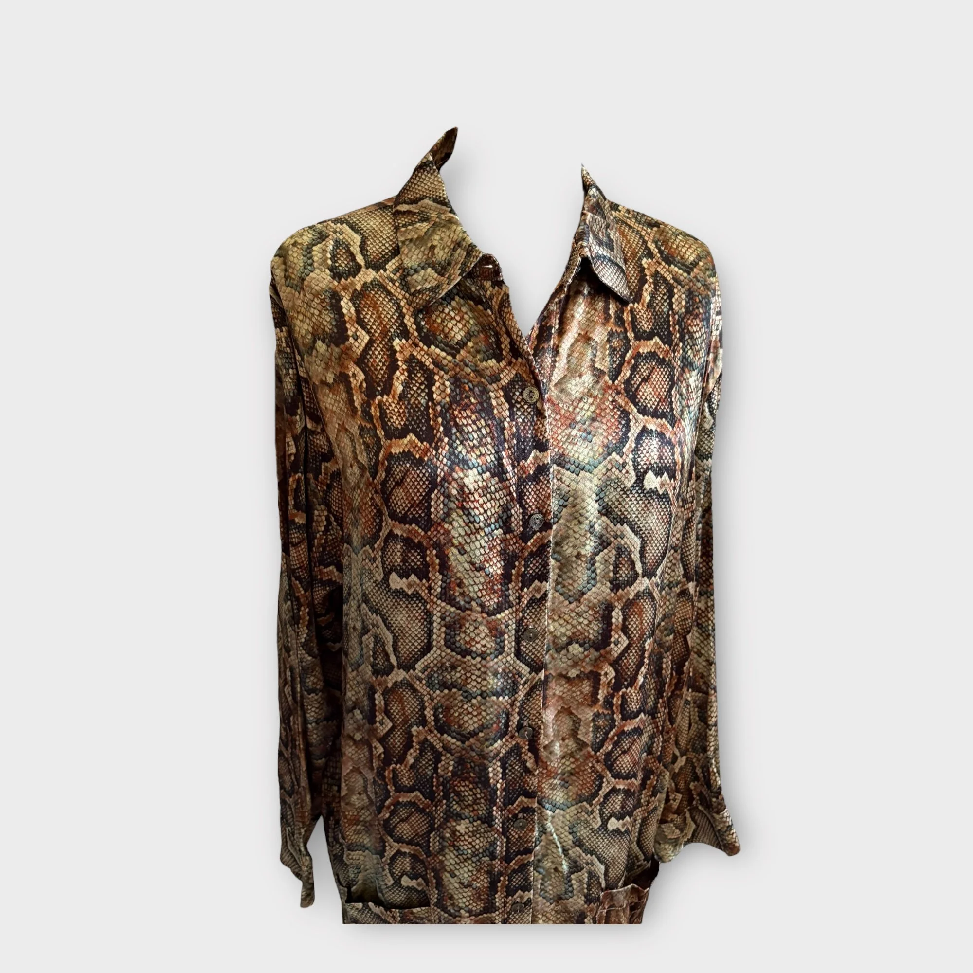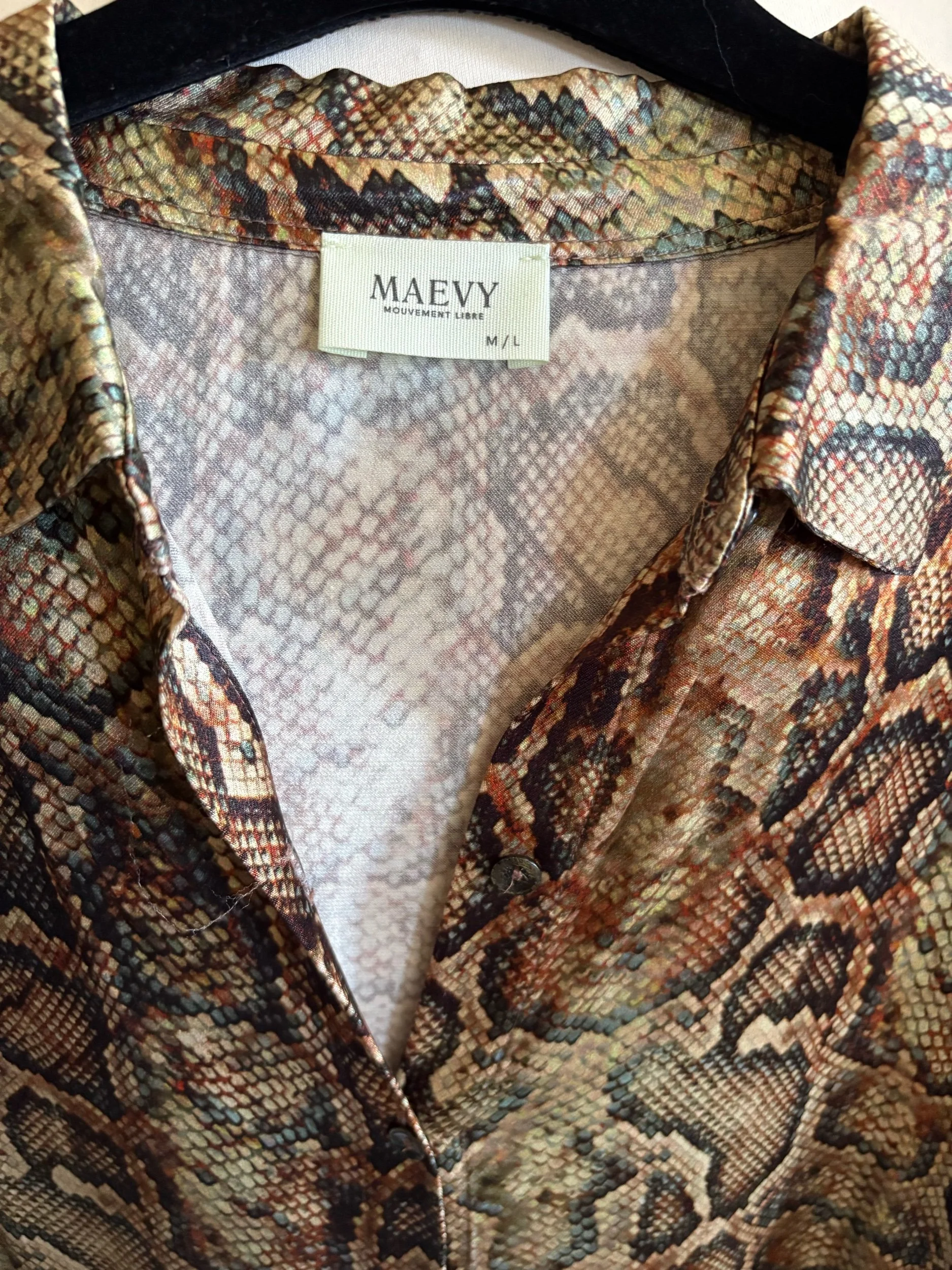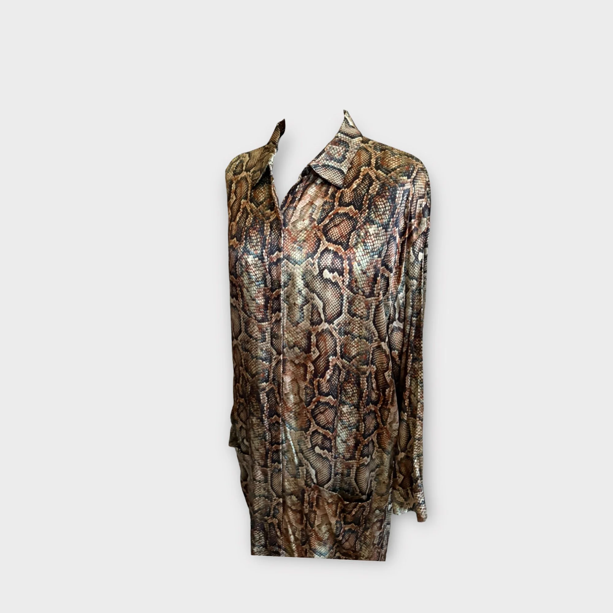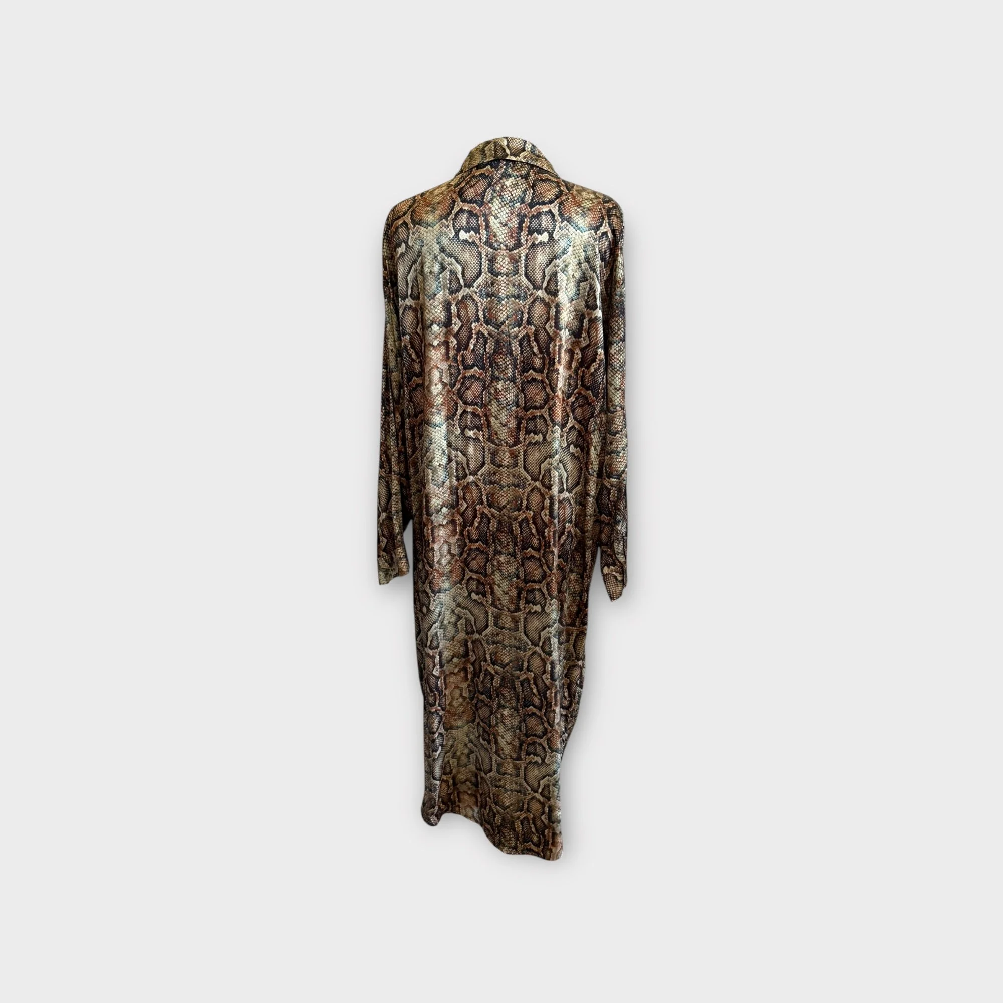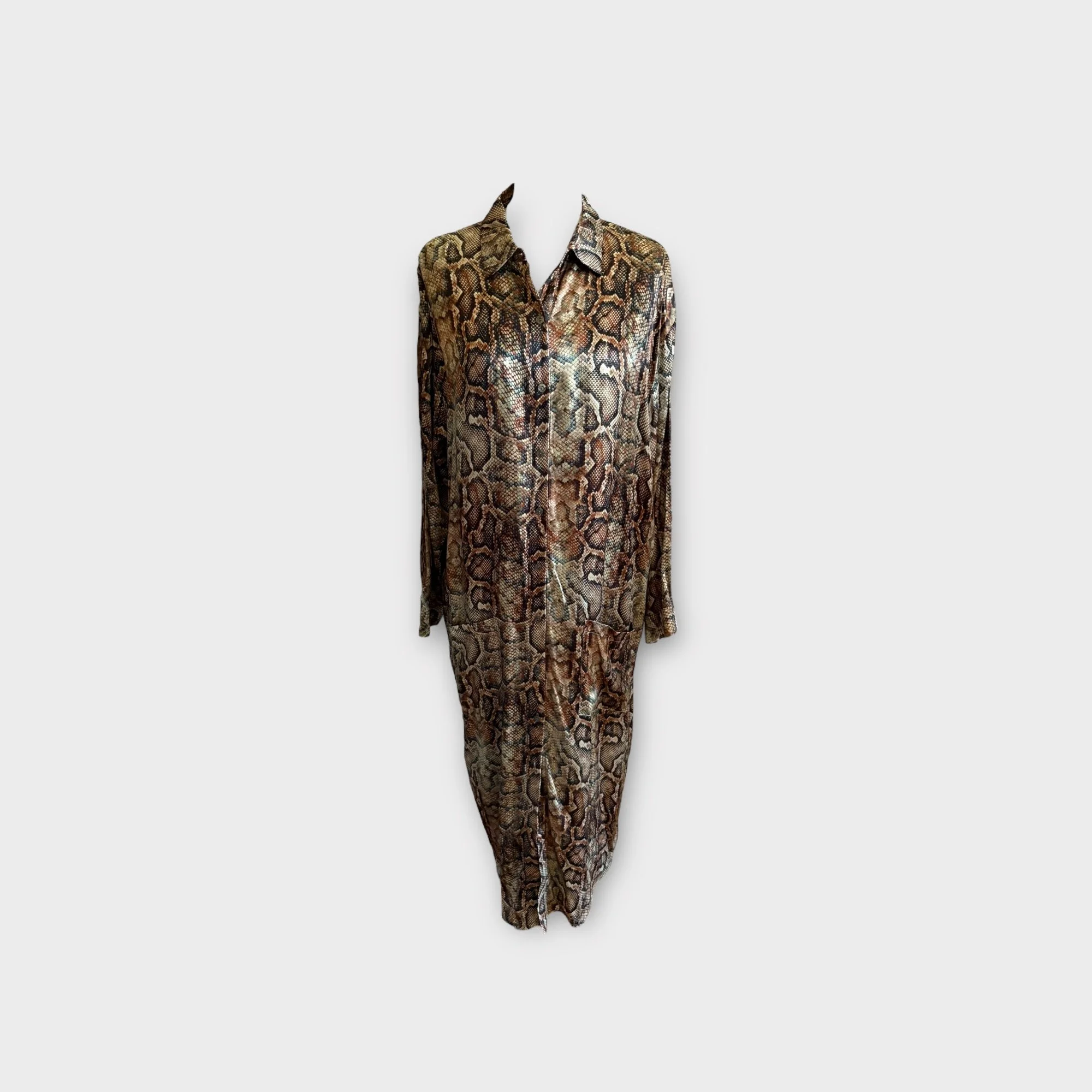 Robe chemise longue imprimé reptile coloris rouille kaki et bleu acier