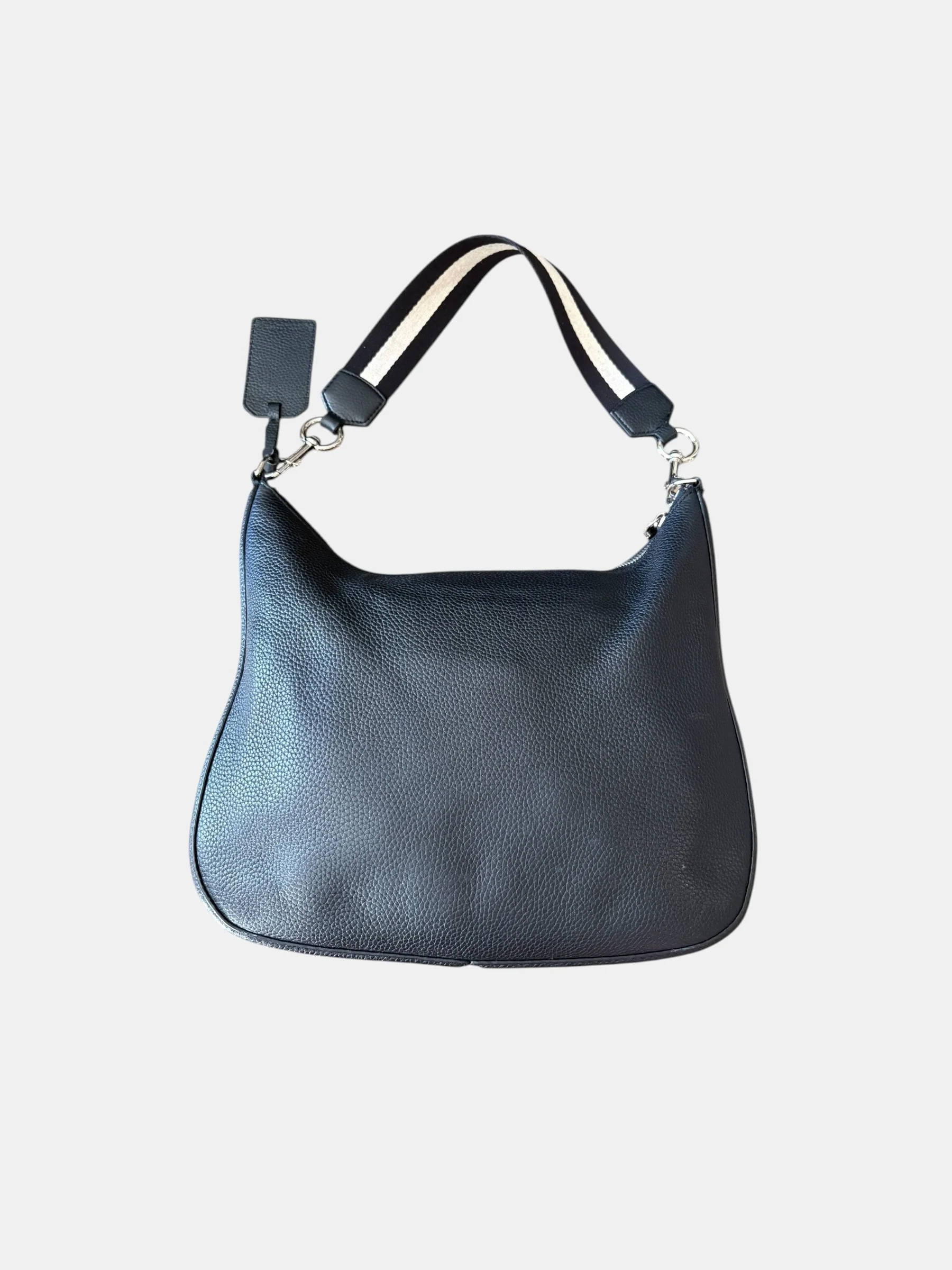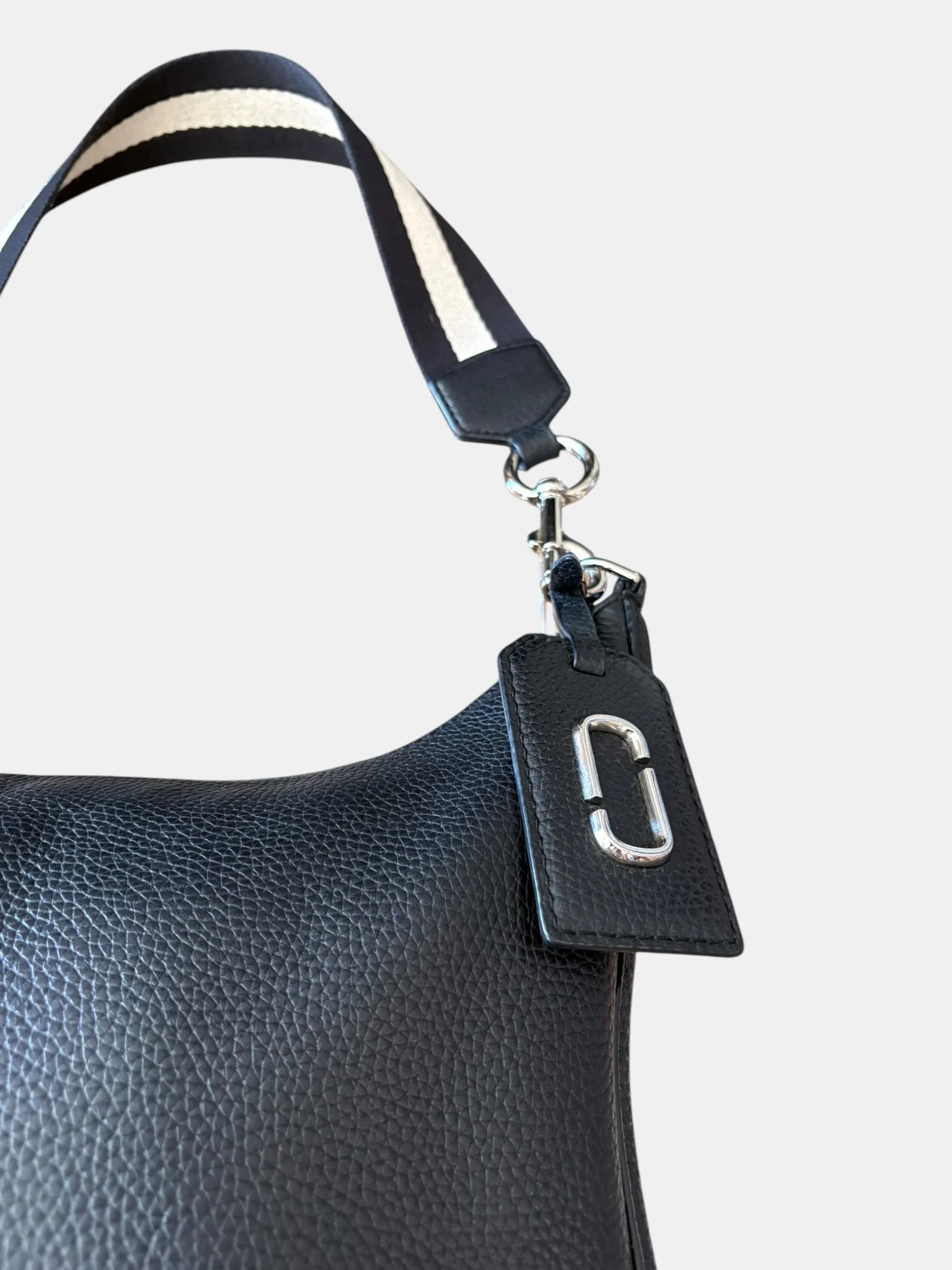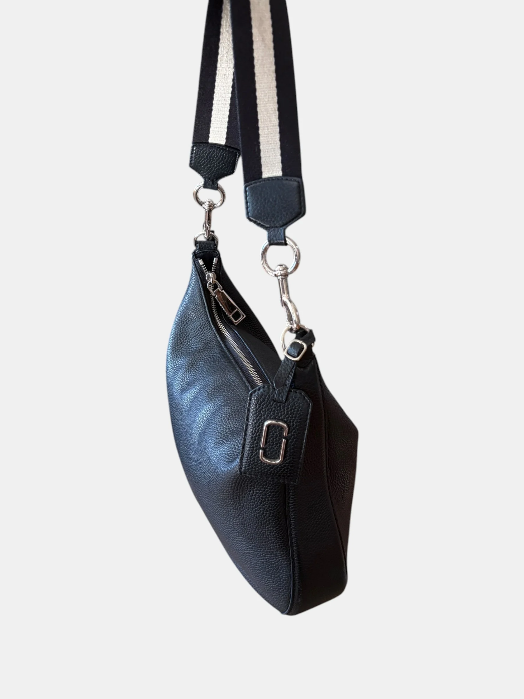 Porté main ou épaule par la bandoulière en tissu à rayures noir et ecru amovible par les mousquetons en métal argenté