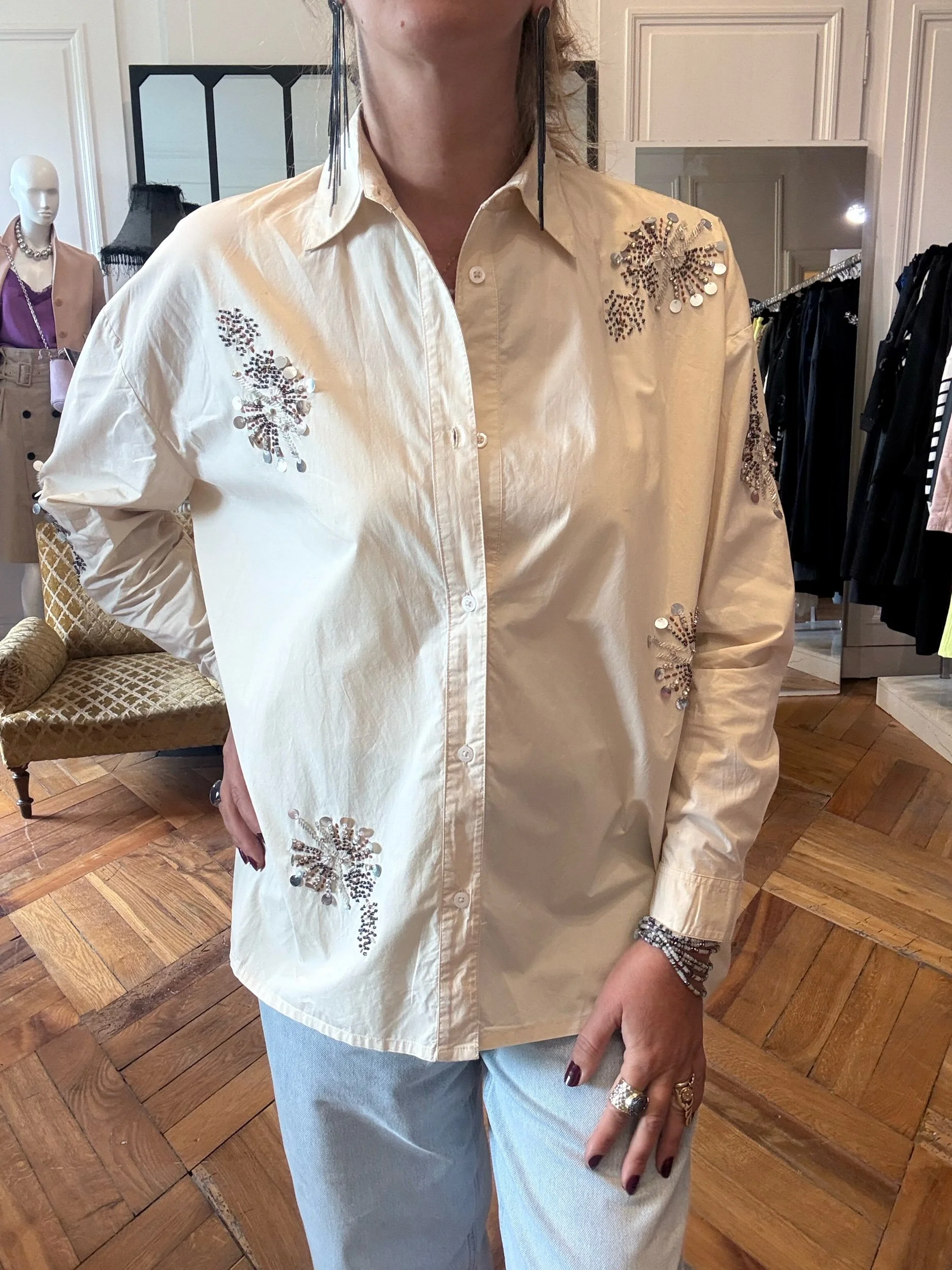 Chemise réhaussée de perles et strass formant des fleurs dispatchées