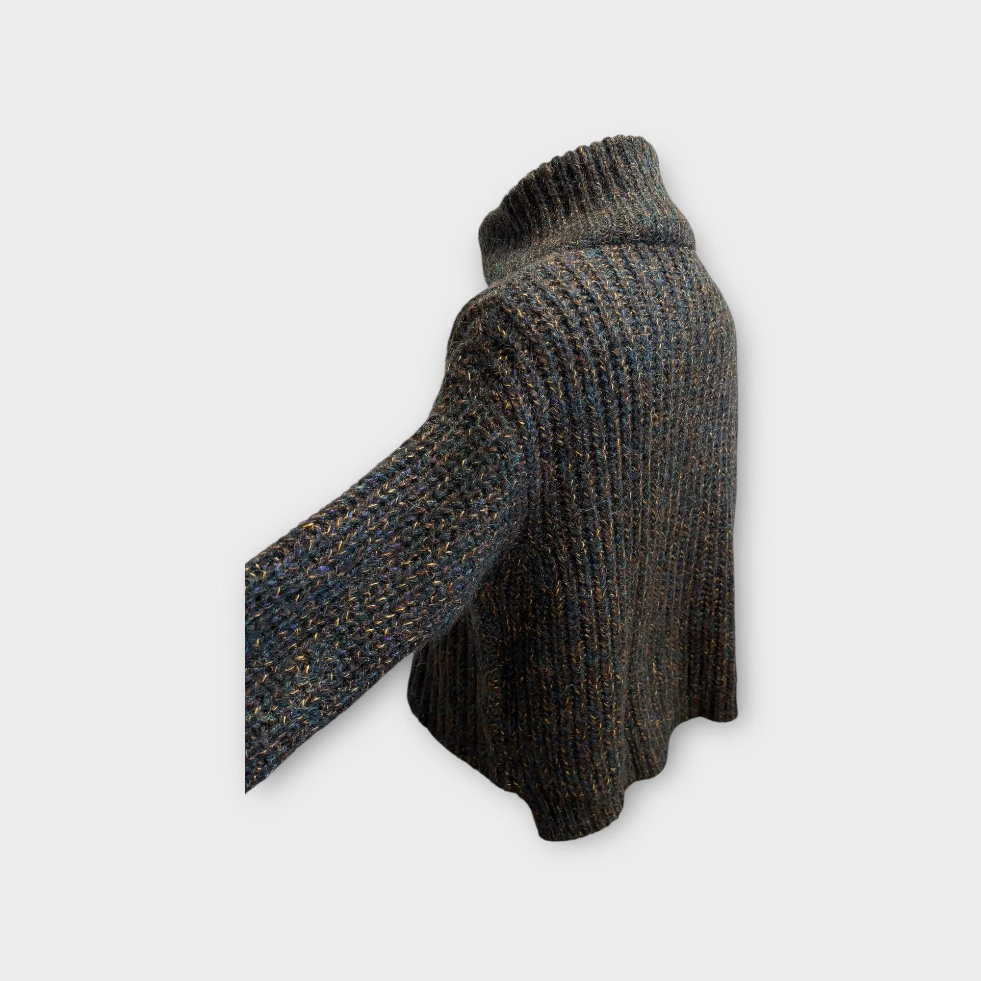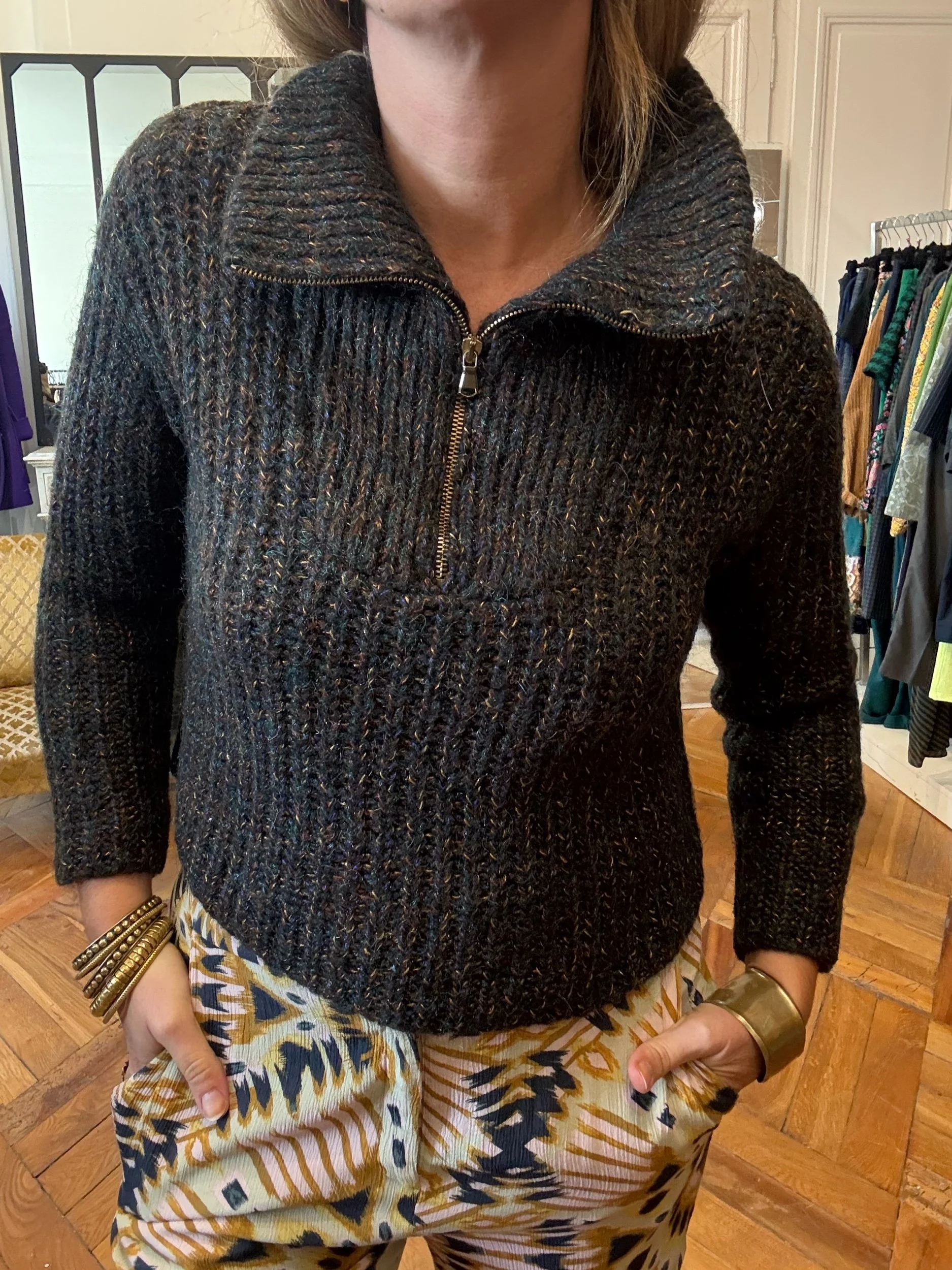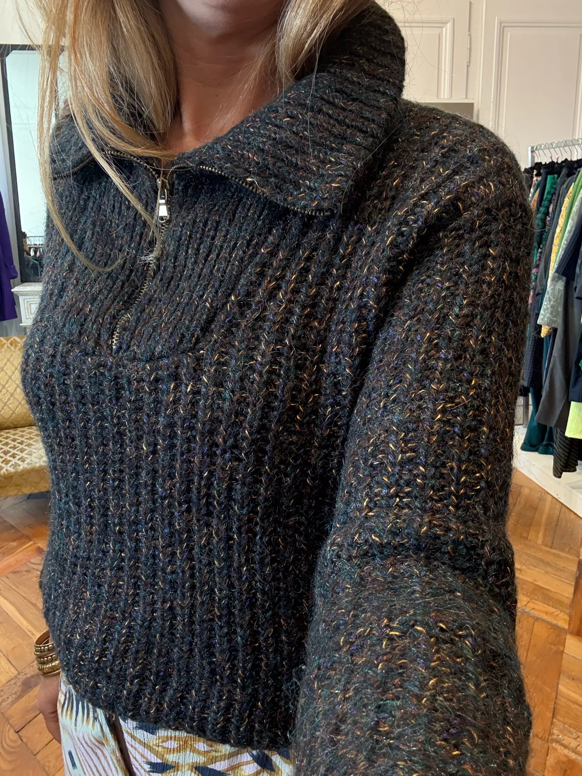 Maille chinée multico vert emeraude, choco, fil violet, doré