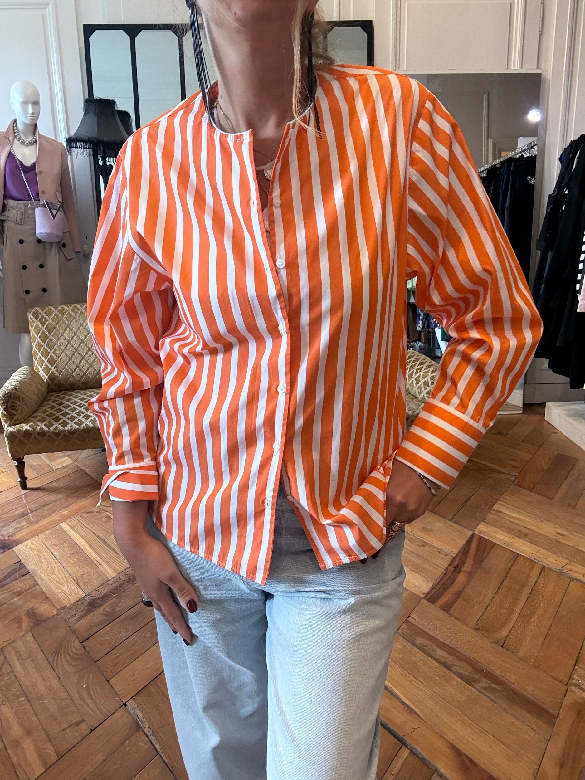 Chemise à rayures blanches & oranges en popeline de coton