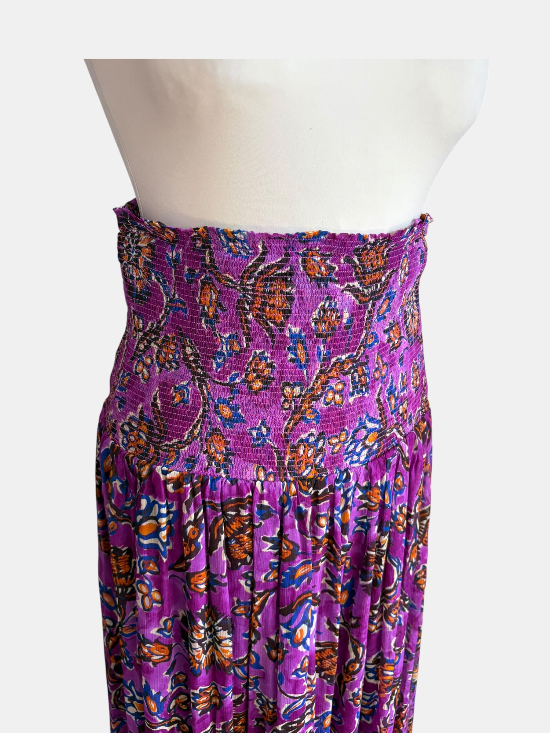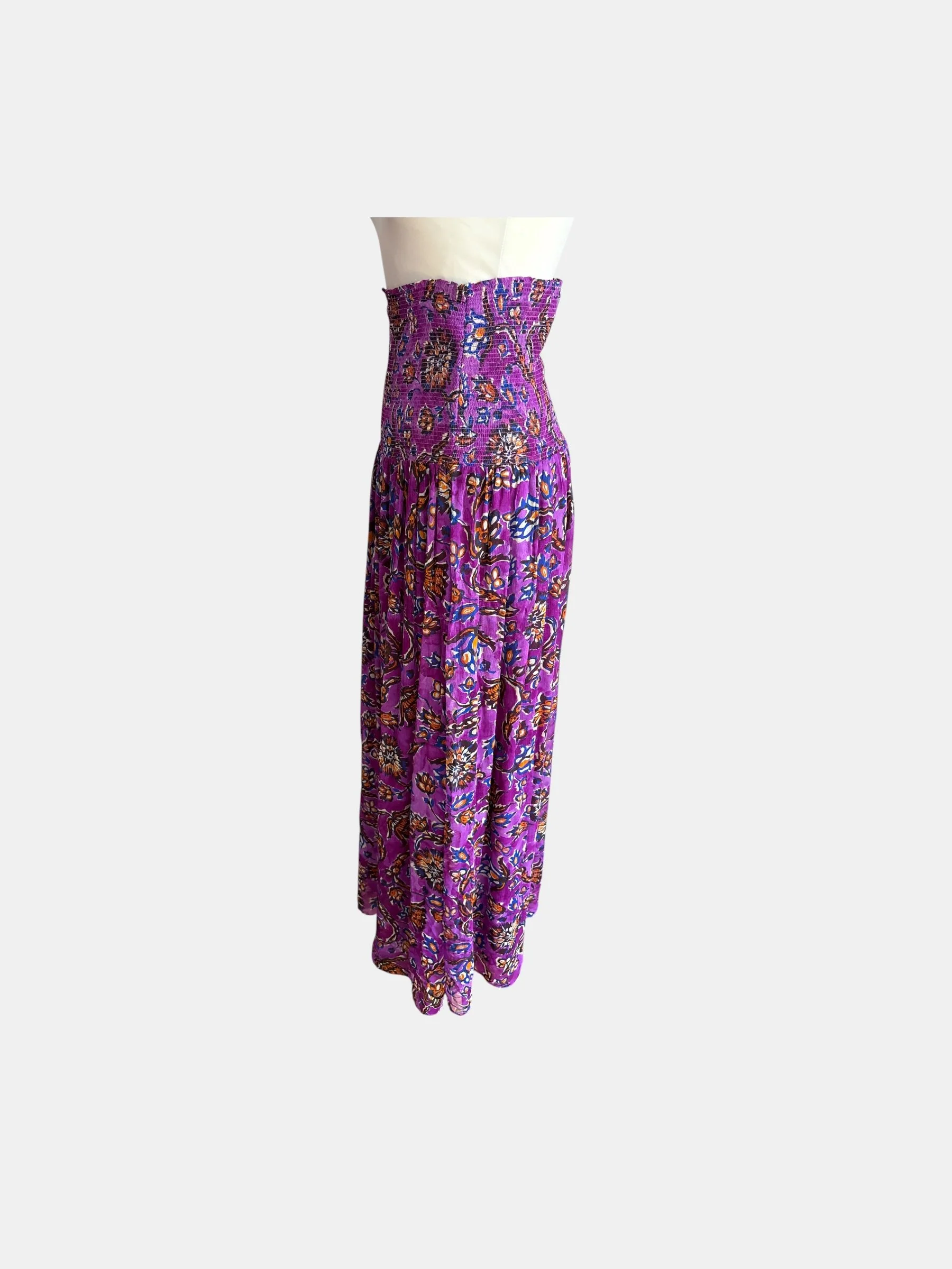 Jupe extra longue en voile de viscose violine imprimé floral orange et bleu cobalt
