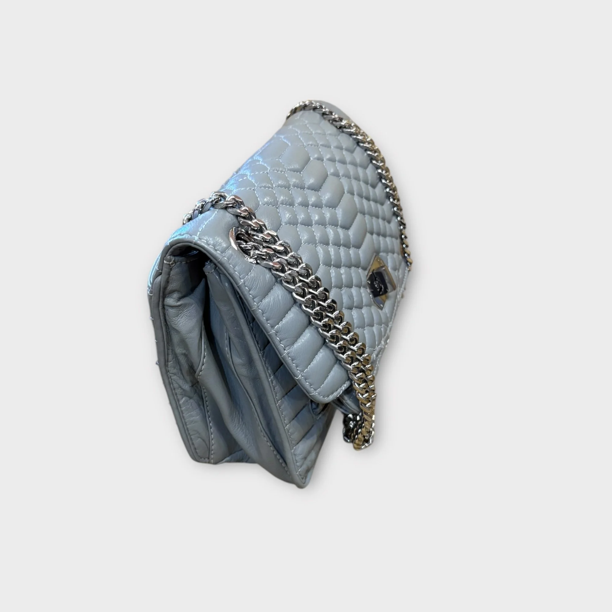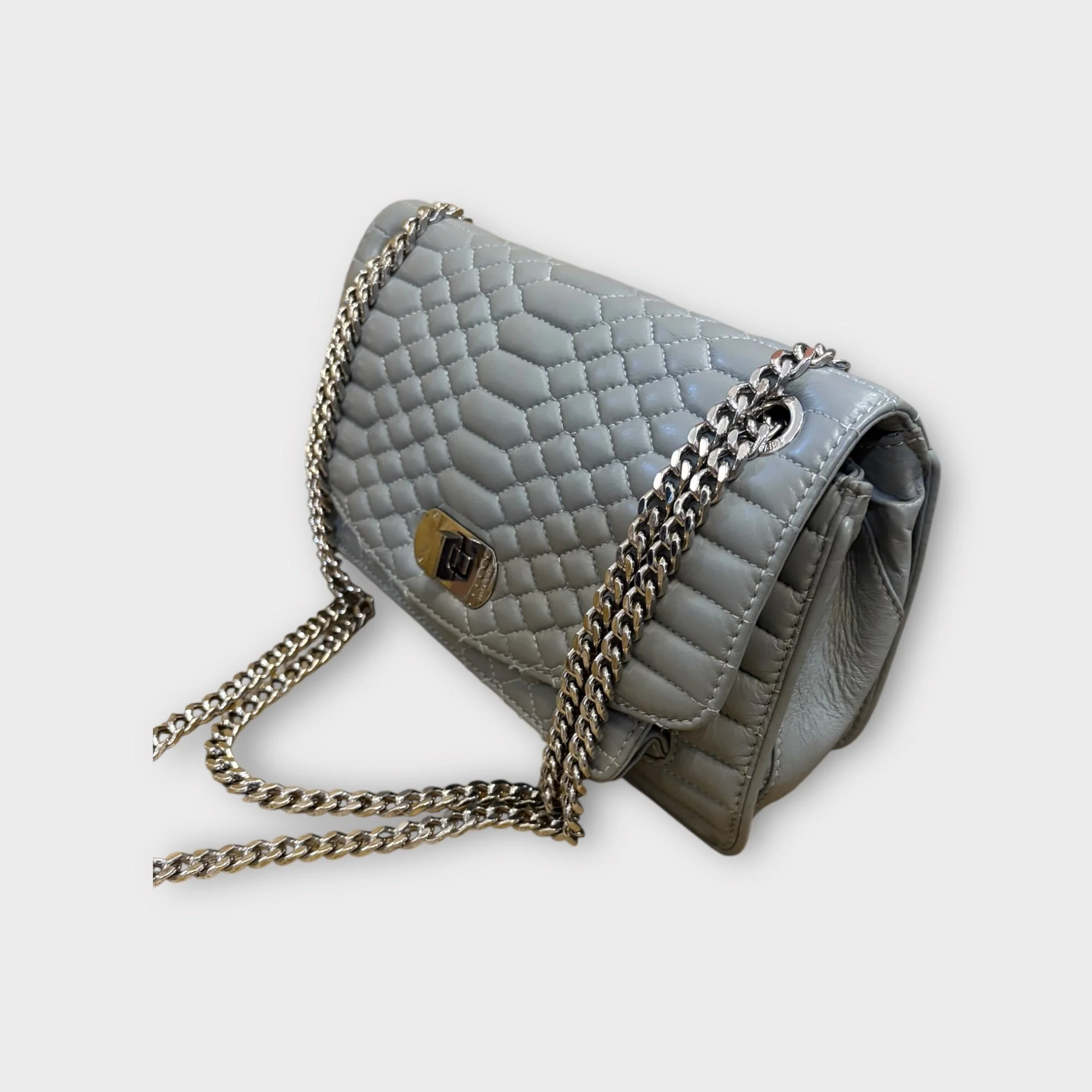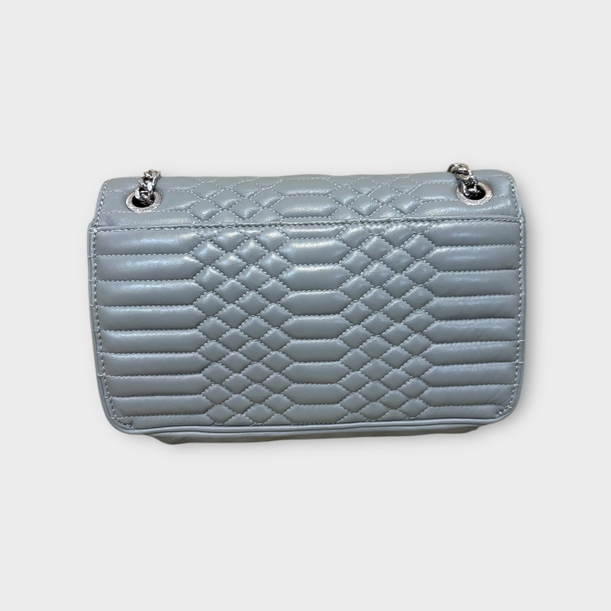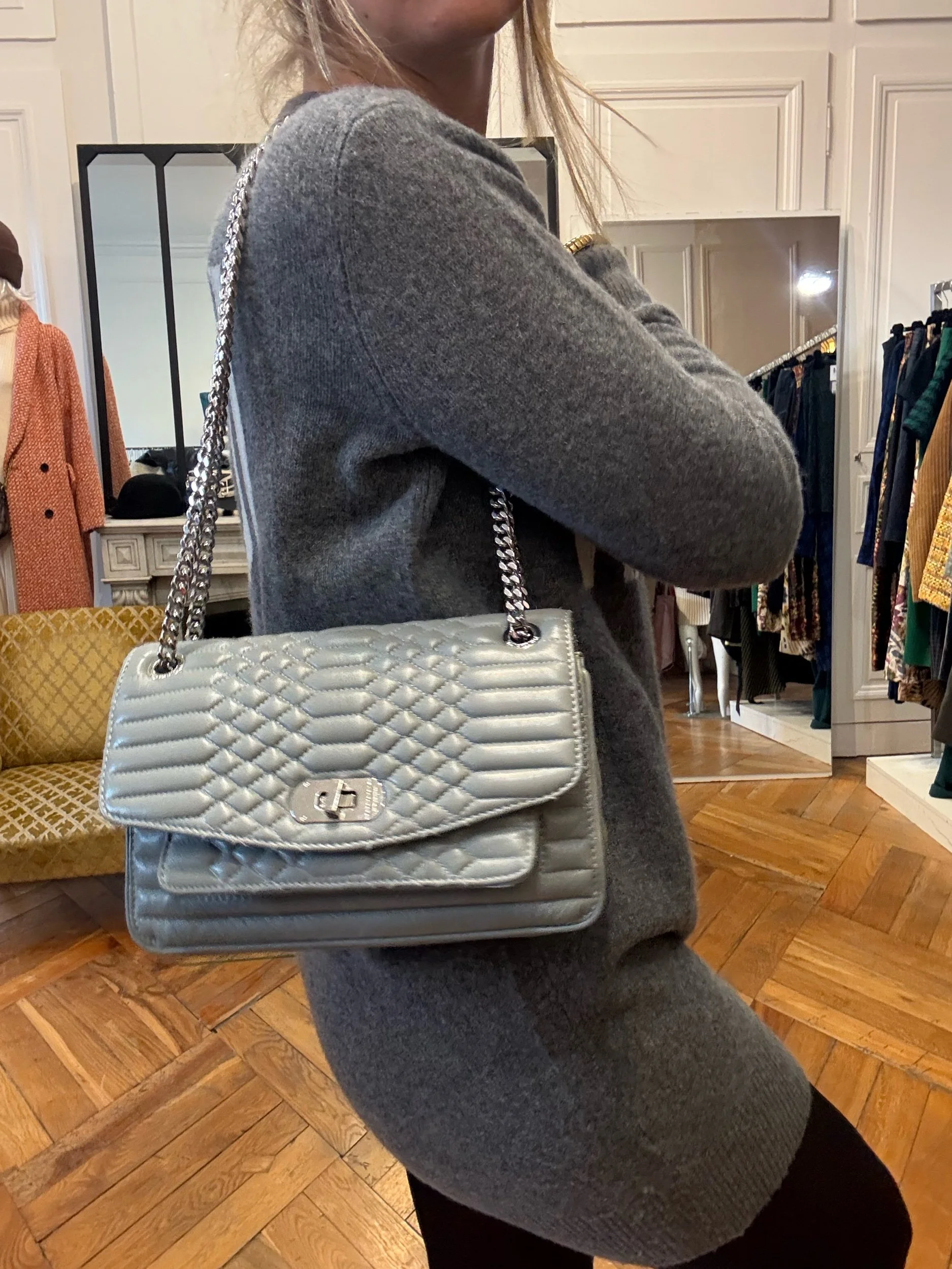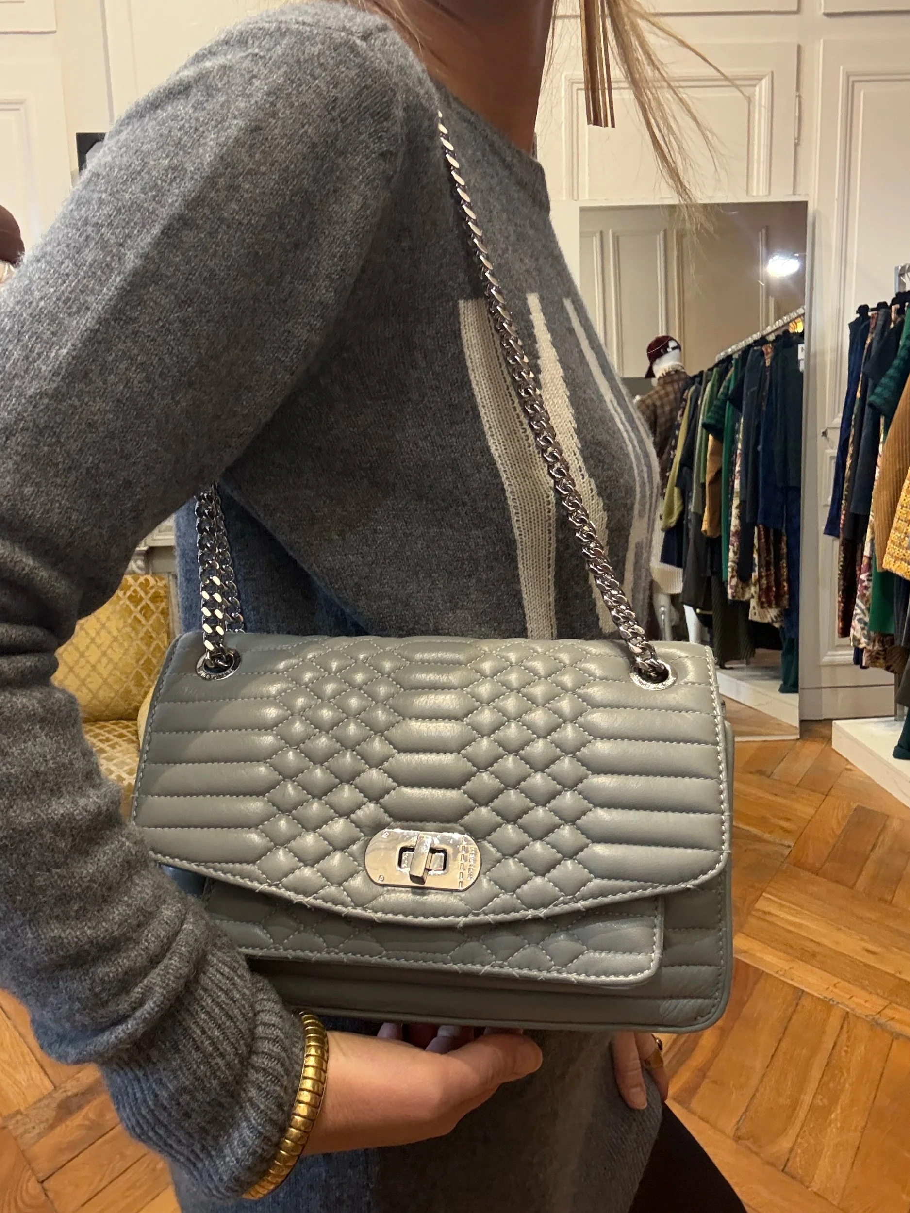 Porté épaule ou croisé par la bandoulière coulissante chaine en métal argenté